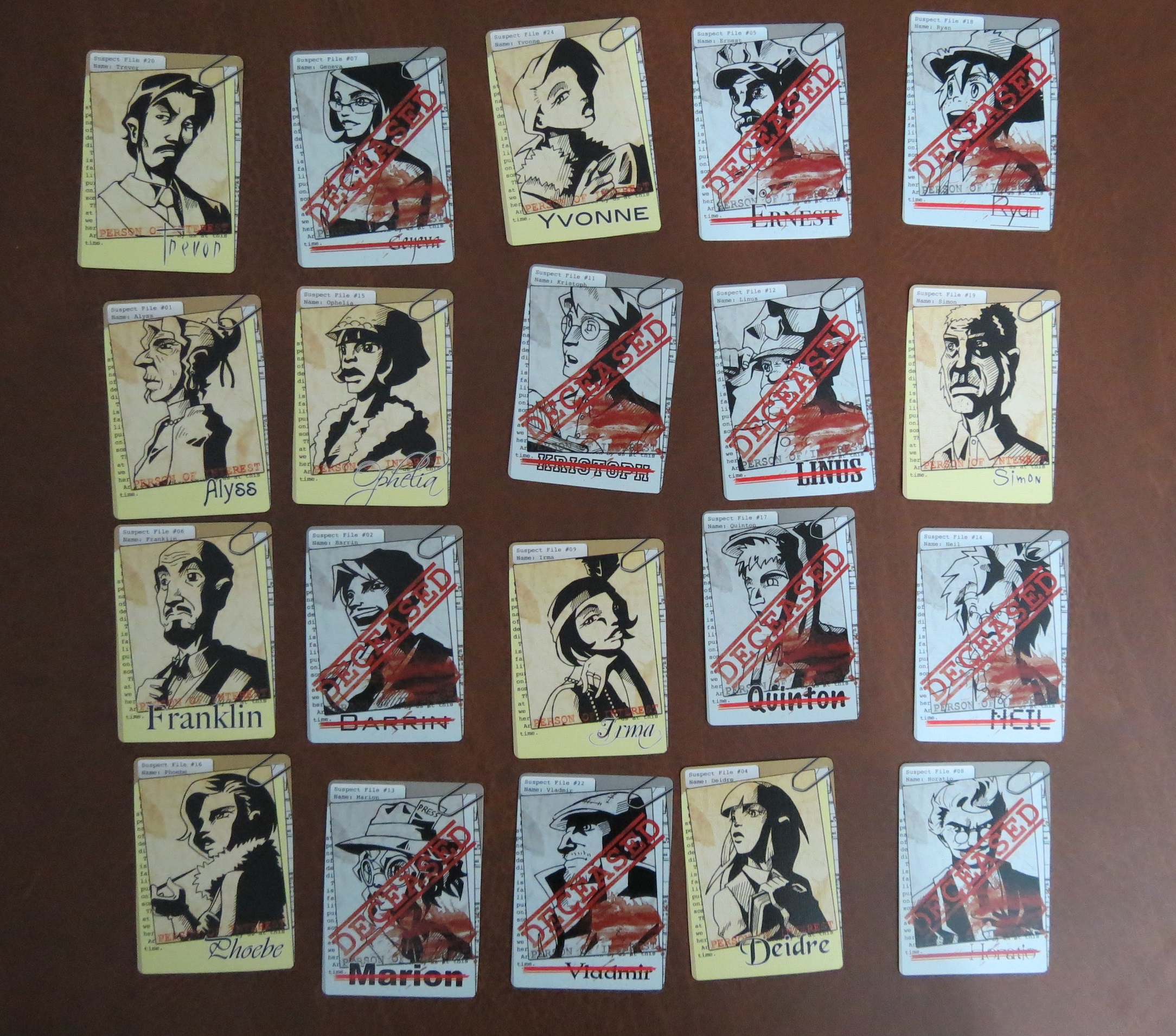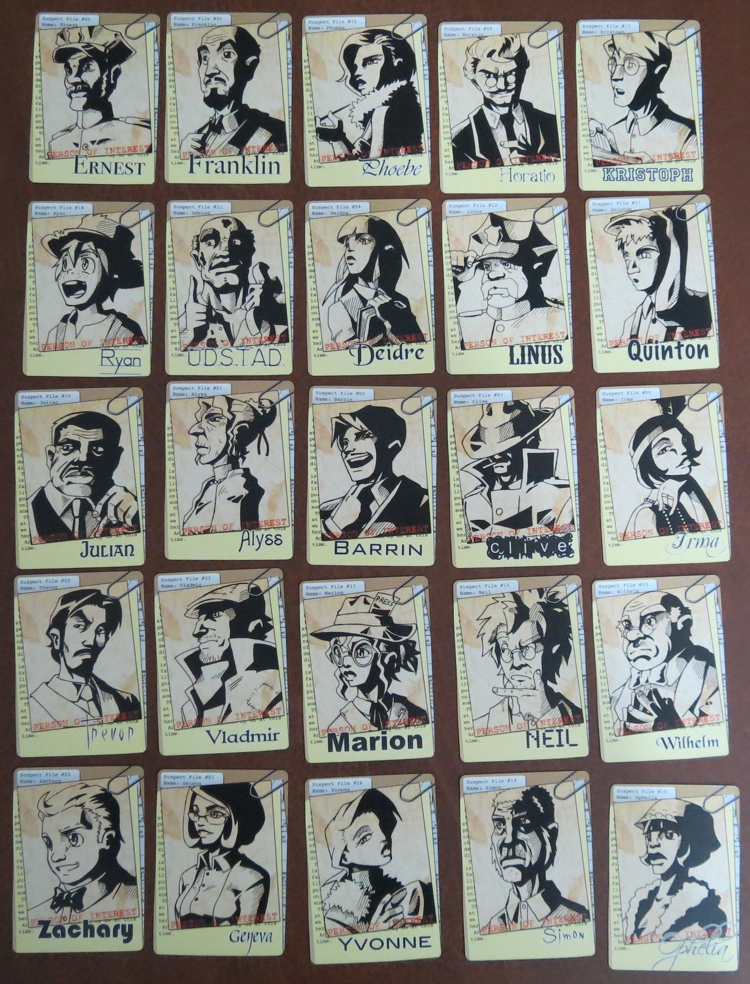 Once you’ve laid out a 5 by 5 grid of suspects, the killer draws the top card from the Evidence Deck, which contains the same 25 people that are now face-up on the table. This is his secret identity. Then he has to kill someone.
