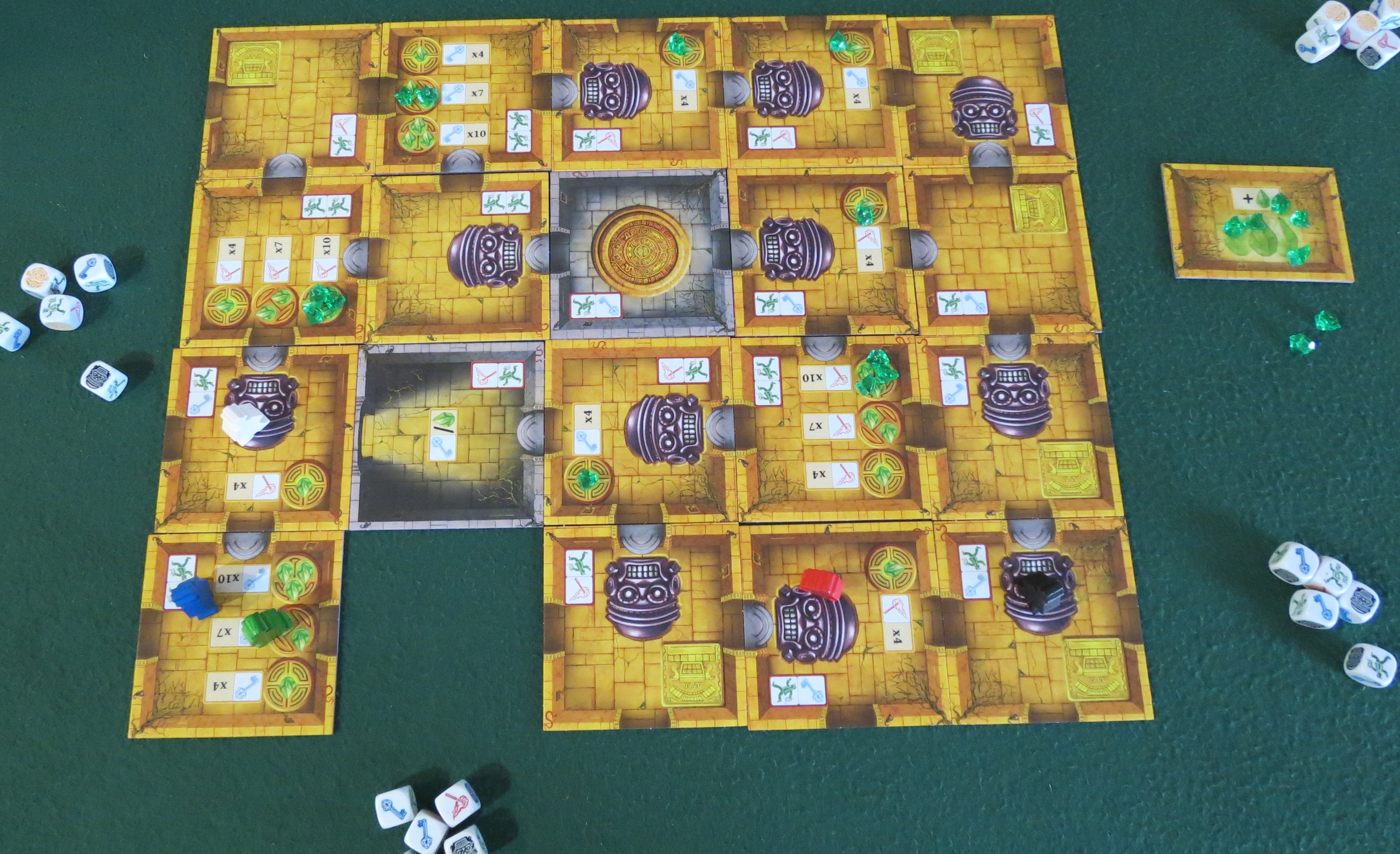 Want to enter a room? First you’ll have to roll some dice — probably for two adventurer icons, as those are the easiest to roll since they’re printed on two sides, but sometimes you’ll need a key or a torch. Exploring, which means you take a chamber from a stack and add it to the temple, always requires two adventurers. So far so simple, but things get trickier.