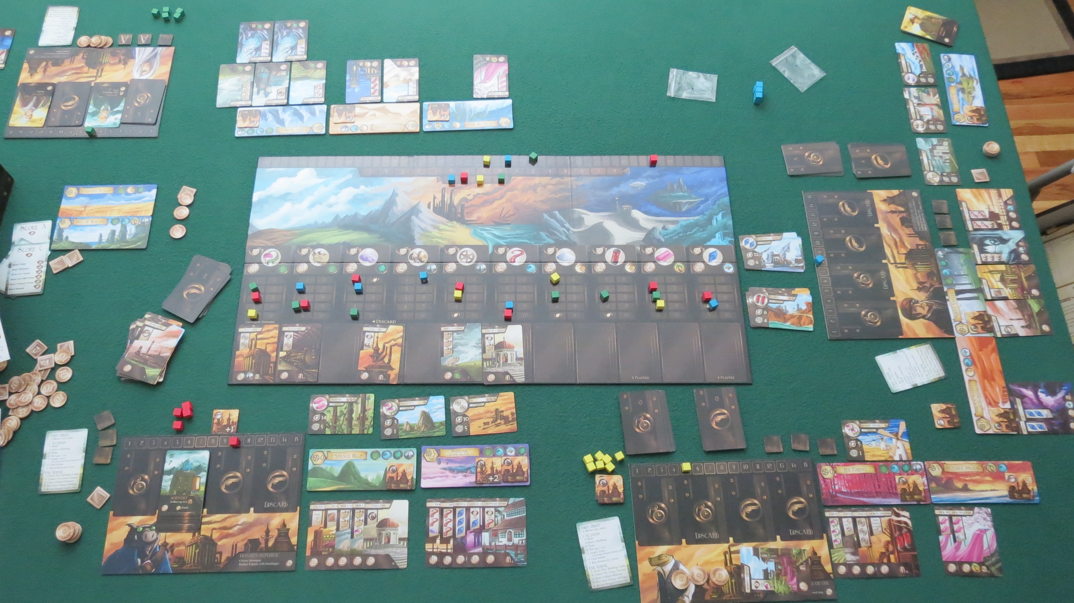 Nah, I’m just making up crap to put on the section header. Still, it feels pretty darn familiar right at first. Like many Euro-themed market games, most of the drama comes from who’s placing little colored cubes on which spaces, and the carefully-selected structures and occupied towns that make those little colored cubes move around. There are ten goods to compete over, each of which is more valuable than the one preceding it — so turnips, srika (shaggy yak creatures), and glow moss are a tier below ore, machine parts, and tentacles, which in turn aren’t as desirable as salt, bottled demons, silk, and magic gems — and nearly all of the opportunities for victory points are tied into these. There’s very little player interaction. Your options are regulated by two sets of cards that you deckbuild as the game progresses. As I said, it feels familiar.