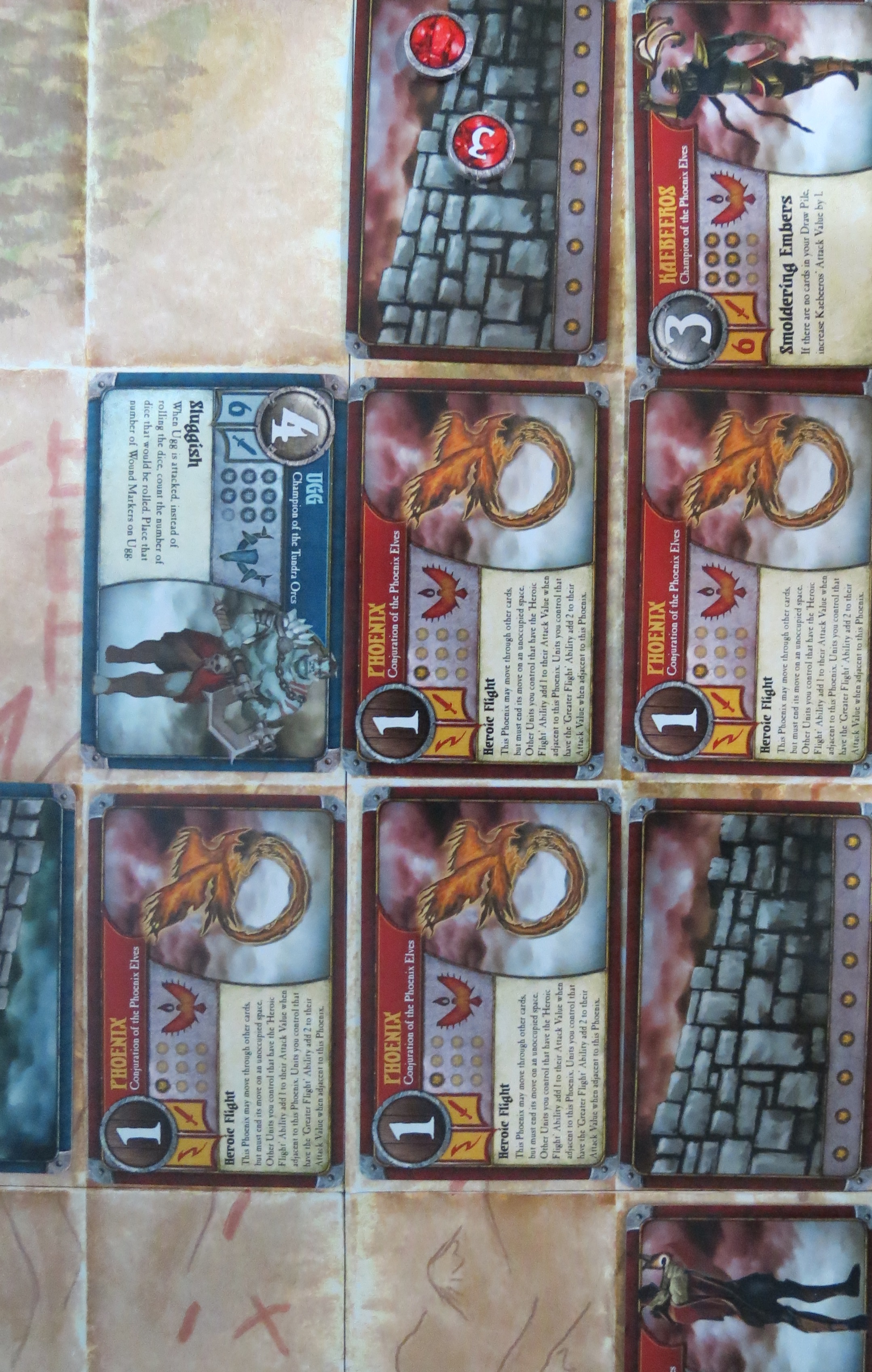 As we played this match, we were thinking there was no way to beat the Phoenix Elves. Not with their new conjured Phoenixes, which were impervious to abilities that attacked “common” or “champion” units, and stacked their attacks when adjacent to one another, and flew over obstructions, and had a real cost of 0.5 magic because you got two of them for one event. Not with their ridiculous precise ranged troops and precise champion, both of which could be empowered to even ridiculous-er heights. Not with their massive army and hit-and-run Queen Maldaria and everything-murdering Fire Dancers and movement-inhibiting cost-0 Firelings.