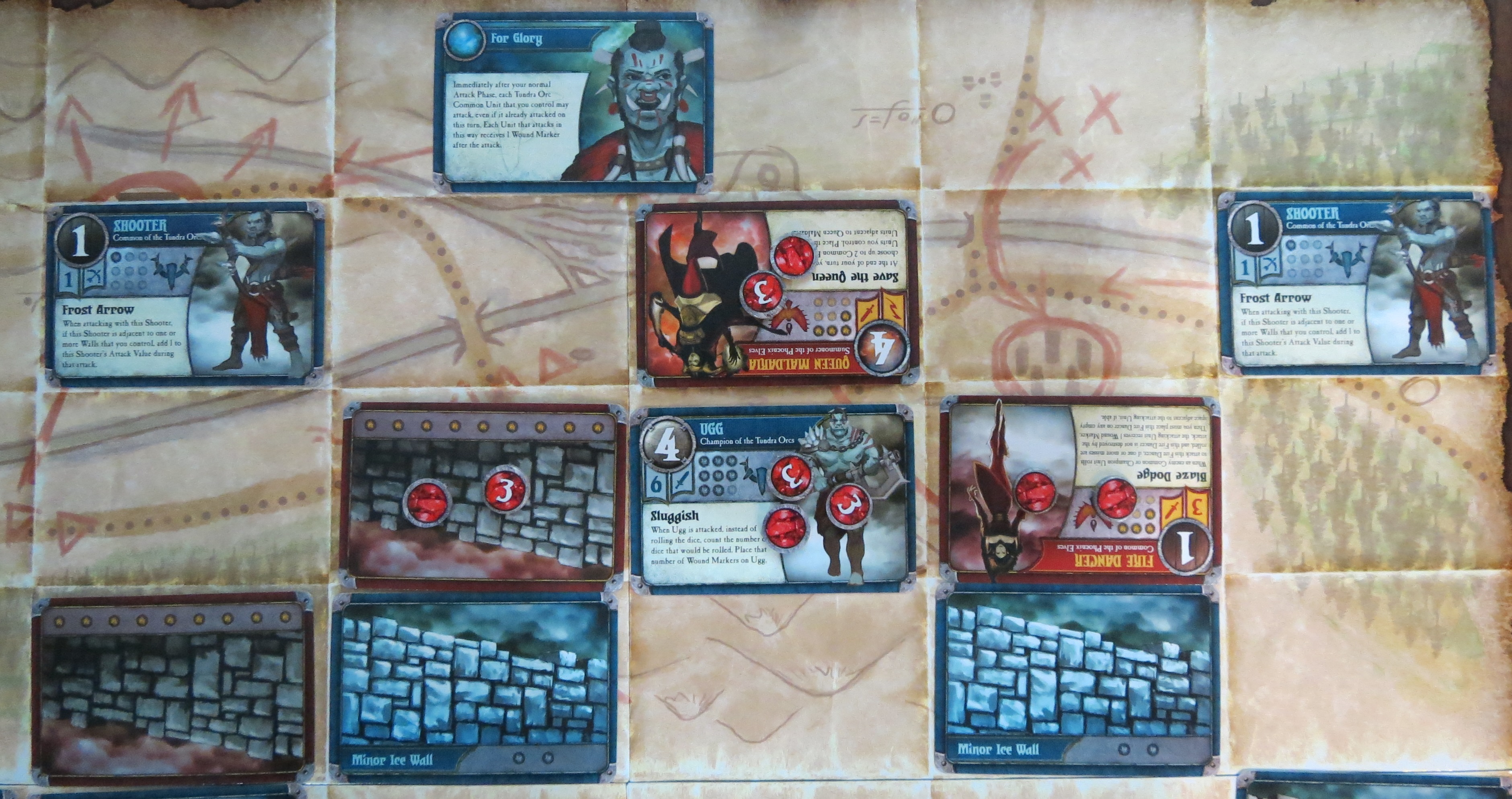 It wasn’t smooth sailing. Grok got pummeled by Duke Ramazall and quite a few Tundra Orcs died at the hands of those pesky Phoenixes. Even so, bit by bit, the orcs came around the south side of the board and blocked the elves’ Walls. They shifted their Ice Walls into aggressive positions, stampeding over flanking Firelings en route. They summoned to those Walls, even though the summoned units wouldn’t live out the round. They bought expensive common troops and protected them with Ice Armor events, and killed so many elves that they had plenty of magic to replace whatever soldiers they lost along the way.