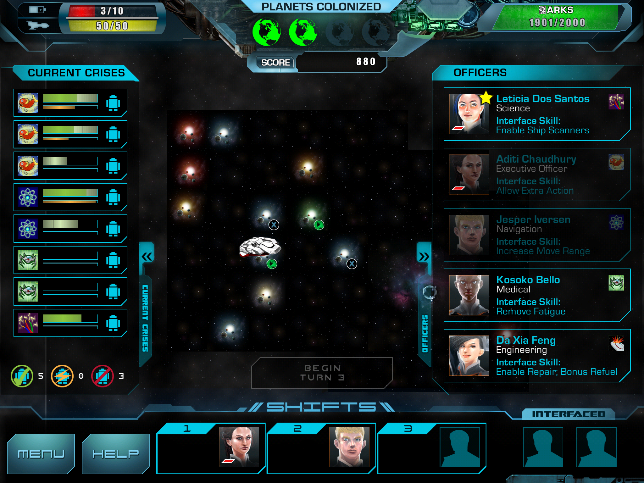 Too bad it doesn’t last. At this point, imagine someone delivering a tired “Houston, we have a problem” joke in hilarious monotone. See, the word “Shifts” doesn’t refer to, say, redshift effect or time-shifts or something exciting like that. Rather, it’s about the rotating work shifts of your five crew members. Every turn you assign someone to each of three shifts, and those assigned crewpeople will grow gradually more exhausted while those who you did not assign will rest up, though the method of their recuperation is a mystery, because apparently they aren’t sleeping: while off-duty, each crewperson grants some sort of passive bonus, like the ability to pilot the ship farther, or an extra action, or the capability to use your ship’s scanners.