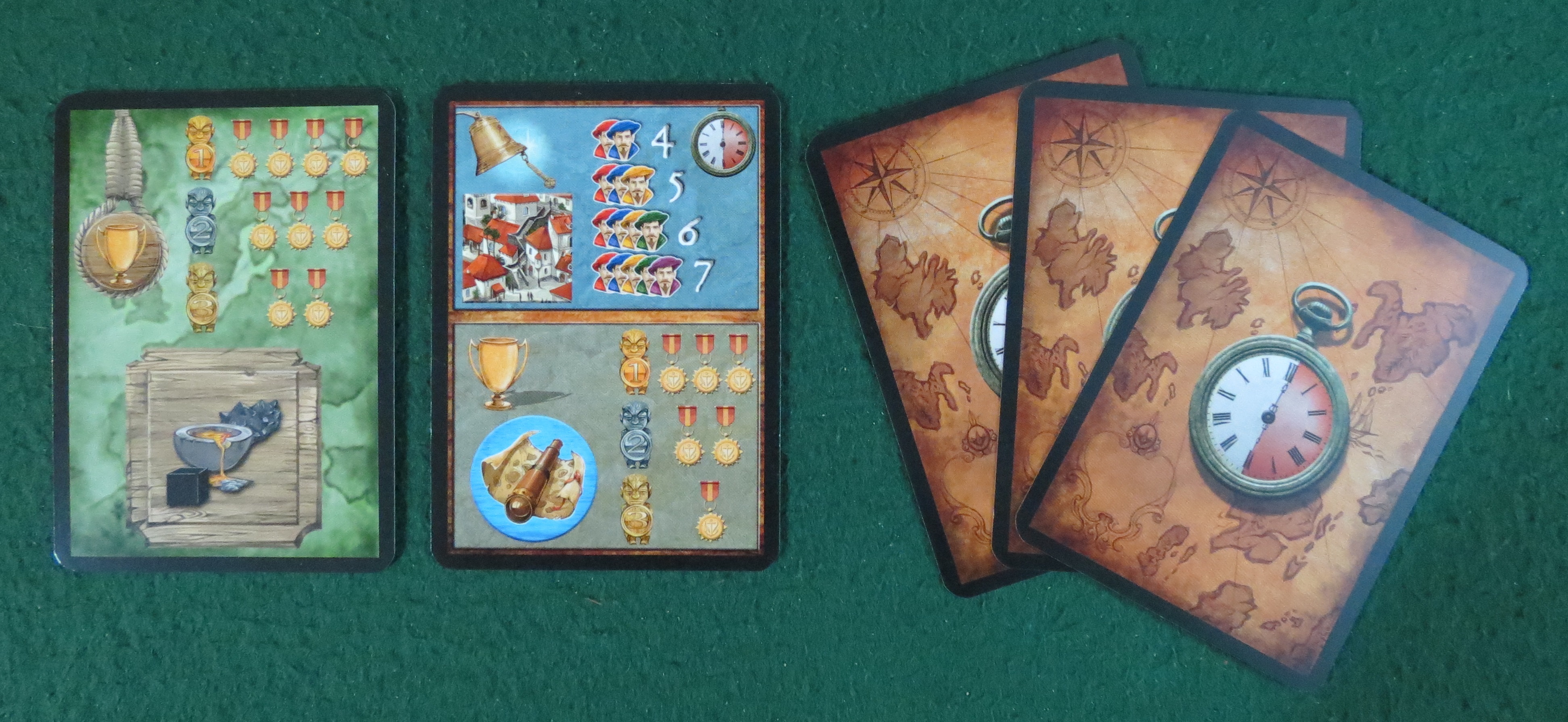 Next, everyone gets an Objective card to hold in secret. These announce two things: not only the other ways to pick up victory points at the end of the game, but also when the game will end. For instance, the above picture shows an Objective that tells us the game ends when a certain number of towns have been founded, and gives points to those who have picked up (and held onto) the most exploration tokens.