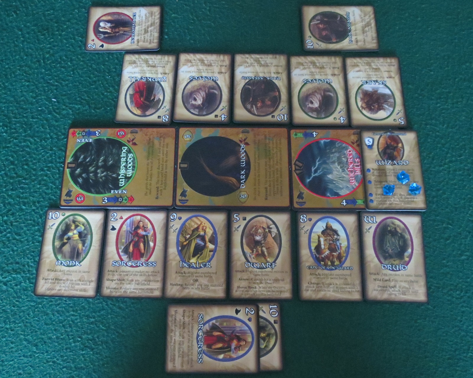 For one thing, its thematic edge becomes rather blunted after only a few rounds. It’s abstract in the extreme, including battlefields that offer capture requirements like “to win, only deploy even-numbered cards here” or “for victory, play a matching pair and a matching trio” or “this region requires a monk and you can’t play wild cards” or “only deploy blue and green cards here.” Add the fact that other than a couple exceptions like the healer/hemlock (the bad guys’ version of a healer, though it’s a dragon), your cards don’t interact or build off of one another, and we’ve got some depressingly flat gameplay on our hands. Most of the cards even dictate which enemy minion they make an attack attempt against, so there isn’t often any element of choice involved there either. For the most part, you might as well be playing “RED TWO” rather than a necromancer.
