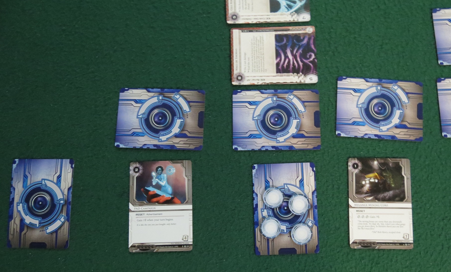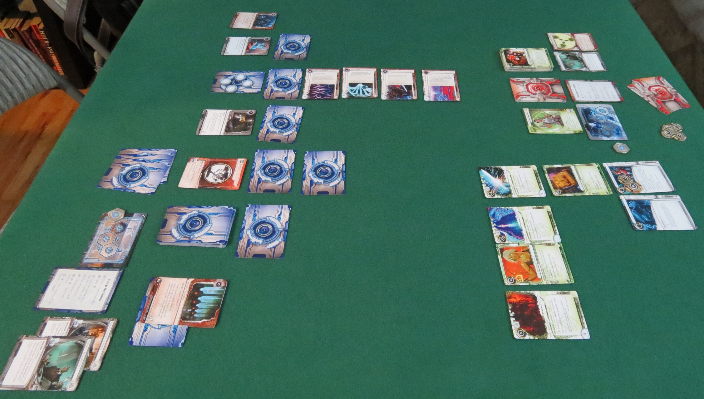 My Junebug deception knocked him out of the game for a few rounds while he drew lots of cards and scraped together more funds, but now Sam knew my tricks. We both settled into a game of cat-and-cat. I set up a couple PAD Campaigns to generate income, he raided one of them and shut it down. He worked odd jobs and designed a master program to earn extra cash, I opened a Melange Mining Corp to keep up. As the ice protecting my servers grew ever deeper, his icebreakers grew better at penetrating them. Both of us became wealthy, only making nettling attacks on each other — small runs, small traps, repeated for half an hour.
