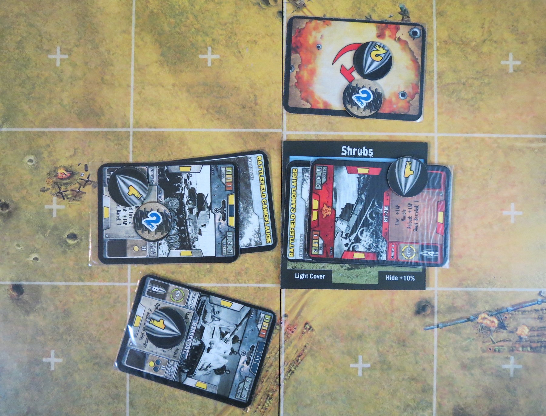 For one thing, both teams (Third Reich vs Soviet Union) come with their own separate pool of options. There are a few shared cards between them, like “Get Back Into the Fight!” for rallying panicked crews, “Commander Spotting” that lets one vehicle take a free spotting action each turn at the risk of exposing the card to being prematurely discarded, and “Battlefield Camouflage” for better concealment, but for the most part, the different teams’ pools are completely unique. The Soviet Union, for instance, has a bunch of action cards that play up their numerical superiority, while the Third Reich has access to Luftwaffe air strikes and Blitzkrieg orders.