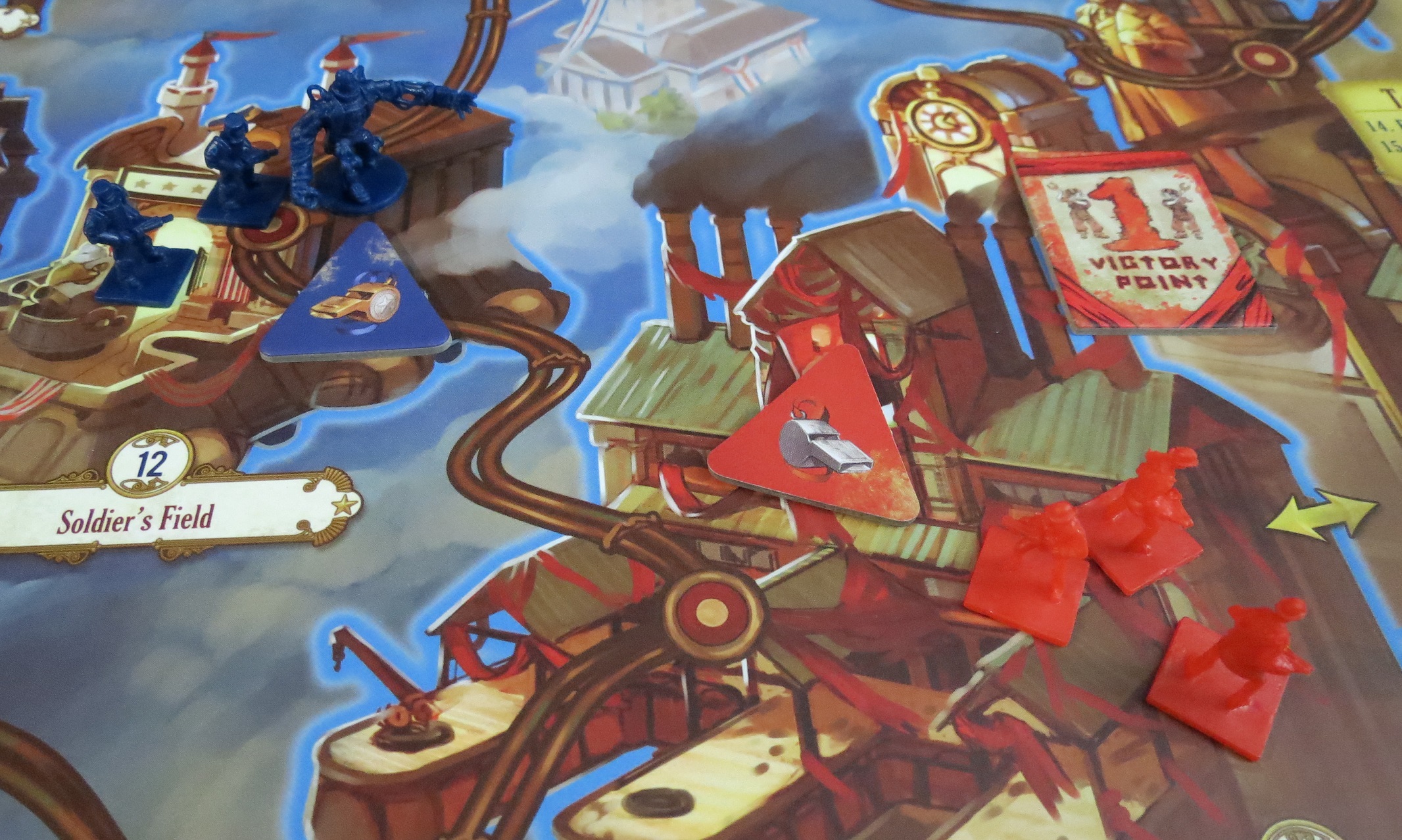 Turns out there’s a few rather compelling reasons when there are sky-lines strung overhead. Somerset takes her chances on the rails and wins big, moving some of her more powerful handymen and leader units right over my defenses. A few card-reveals and dice-rolls later, I’m down two victory points because I don’t control all of the northwestern territory’s three locations anymore.
