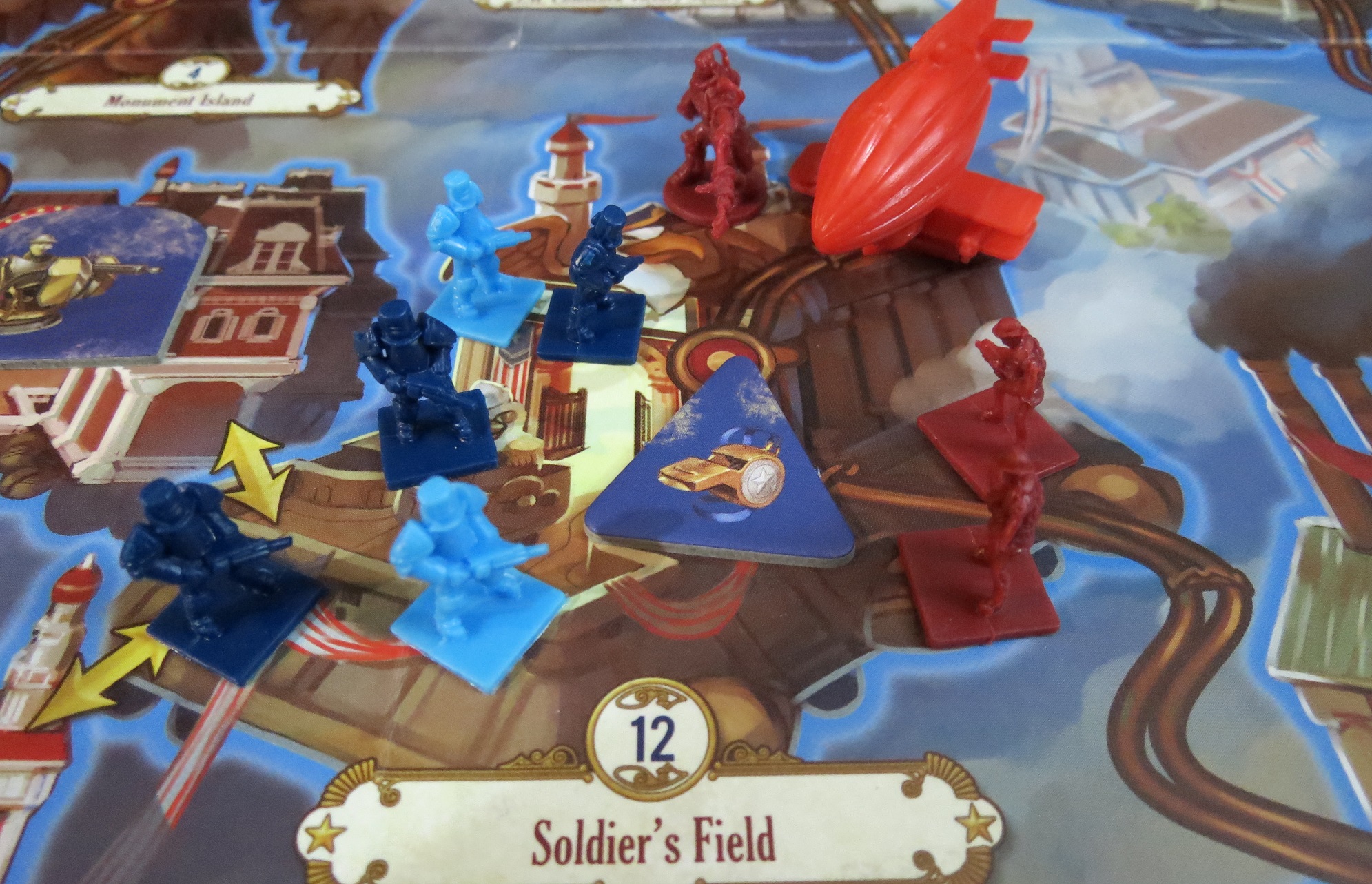 There are a dozen things I want to tell you about The Siege of Columbia: how its mechanics and theme perfectly intersect, how effortlessly familiar it will be to fans of the videogame without requiring its players to know anything at all about the world of Bioshock Infinite before they’re allowed to enjoy it, how it tells the story of a very special young woman and the broken man tasked with rescuing her as you play, and how that story is both fascinating and impactful on the gameplay without ever overshadowing the action. I could go on for four or five thousand words if I really believed anyone would read all that. Instead, since I’m unconvinced anyone is particularly interested in my word-vomit, I’ll start by telling you that the way the game handles movement is really, really cool.