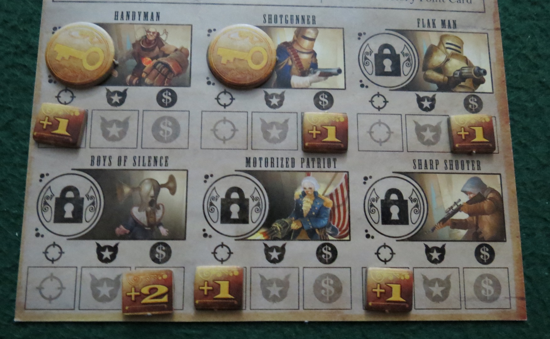 Anytime you win something — the first player vote, a victory card, a battle — or when you decide you can afford to spend a little extra cash, you get to pick an upgrade. These can improve the values on any card, making them better in combat, more influential, or worth more silver eagles. Have you found you really don’t like using Shotgunners in battle because you’ve had bad luck in the past? Boost their values and spend them for heaps of influence or cash instead!