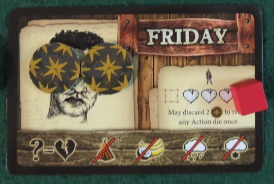 My favorite picture in this review is of Friday with the determination “coins” on his eyes… Poor Friday, he never could get the hang of the hammer and nails. I have enjoyed the times I’ve played this game and it reminded me strongly of all the good (read: non-boring) parts of the book of the same title by Daniel Defoe. You have setbacks and successes and it’s all very exciting and realistic to figure out how to survive on this inhospitable island!