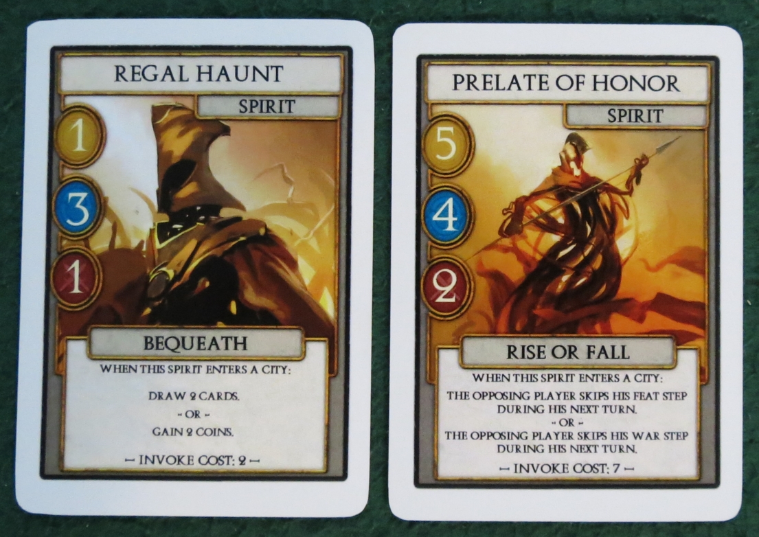 Besides that, it seems John Clowdus has honed his design sensibilities over the years. The biggest change to the rules kicks the older version’s madhouse combos in the balls, dropping the infinite hand and gold limit in lieu of a 10-gold and 7-card max. There are still all sorts of wild combos to pull off, but since you can’t game the system — say, by saving up obscene quantities of gold and soldiery to avoid triggering wars on your opponent’s turns and eventually unleash an ultra-round in which you dominate all three cities and take three feats at once — it’s less cheese and more meat. I approve of this change too, though of course you don’t need a new version of Omen to make it possible.