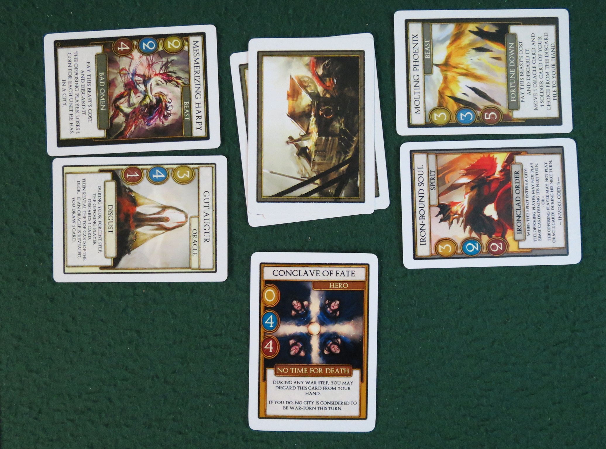 The second addition are the Heroes from the Forgotten Oath expansion. These guys can be used in multiple ways, either deploying into cities for a quick strength boost or acting as interrupts that will make your opponent kick you in the shin under the table. For instance, you could use the Conclave of Fate to cancel a series of ill-advised battles, the Three Hundred to gain an extra turn at the end of the game, or the Scourge of Troy to cancel an enemy soldier’s ability. All of these make an already bastard-mean game even more bastardly. I approve.