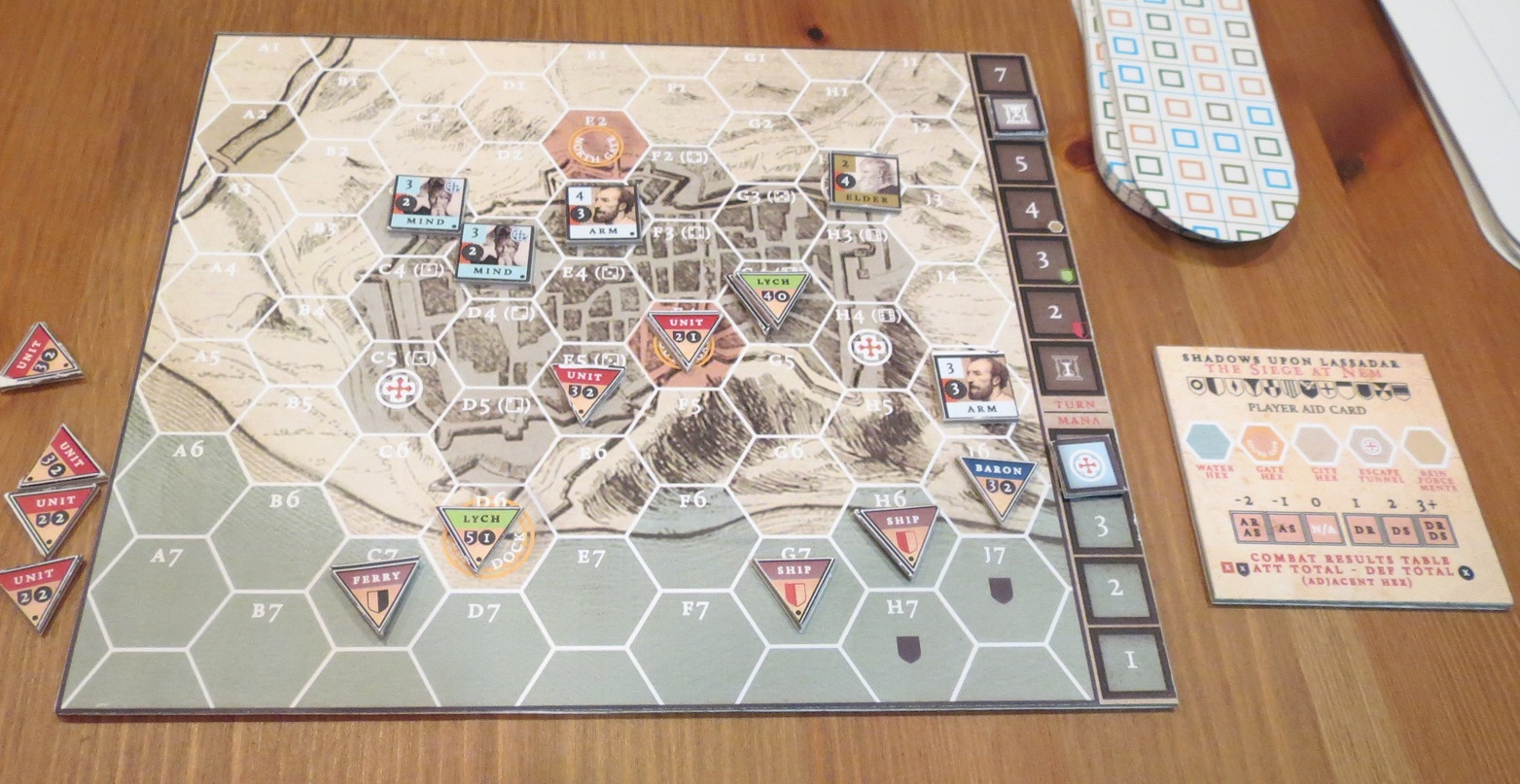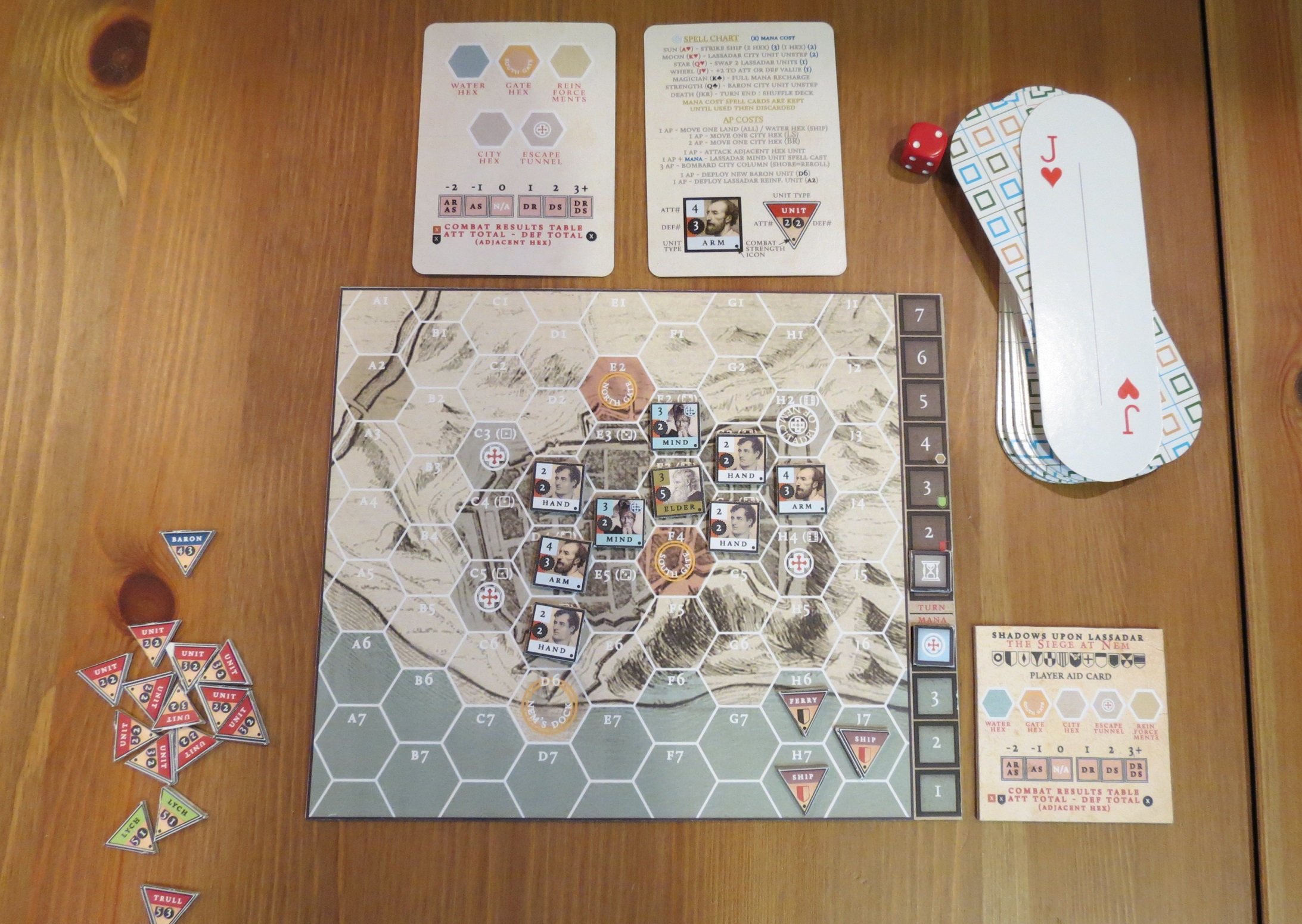 I mentioned above that Siege at Nem can be played as either a solo or a two-player game. Up till now I’ve been talking about it as the latter, though the rules and mechanics remain much the same when you remove one human brain. The main difference is that when playing solo, the Baron side is programmed to run a certain way, and it gets a bonus action each turn and an additional point of combat strength as a handicap. No matter what happens, it’ll always advance its goals the same way, bombarding if it has enough action points, deploying the strongest possible unit, running the Baron away from Lassadarian assassins (“Lassassins”), and marching ever closer to the citadel of Nem. This programming is serviceable, and especially with its bonuses and the luck of the draw it can still provide a decent challenge. Still, it will never march around to the North Gate, or prepare ambushes for fresh reinforcements from the northwest, or hide away its pair of Lych units to drain your mana each round.