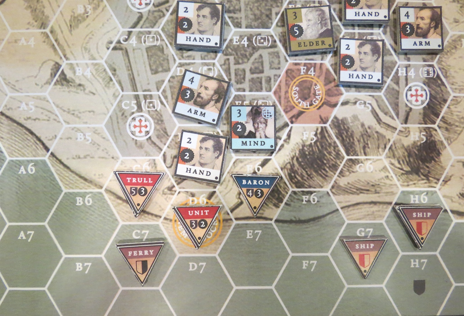 The forces of Lassadar, the besieged Wardens of Nem, just need to hold their citadel for seven full rounds, at which point… well, I’m not sure, since reinforcements start trickling into Nem from the northwest on the fourth round, so maybe the barons just give up? Seven is a lucky number? The dread barons fear battles that last eight days? Not sure. Anyway, that’s Lassadar’s goal: hold out for seven rounds, and don’t get dead in the interim. On the other side of this bloody coin, the Barons need to take that citadel, but should also take care to protect their precious baron unit, because if he dies, the siege falls apart. This creates an interesting dynamic for both sides as they divide their time between offensive and defensive actions: as Lassadar, do you retreat to the citadel, hold the city’s two gates, or go baron-hunting? As the Baron, do you have some troops linger to protect your leader, or send everyone forward for the much-needed push on enemy chokepoints?