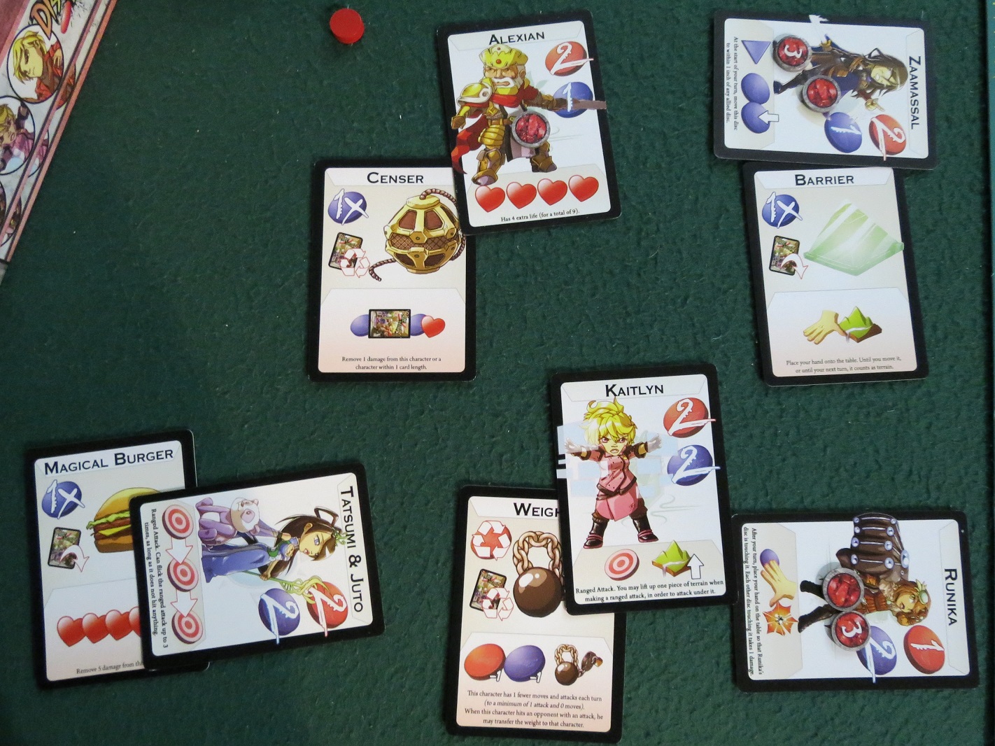 Which brings us to the “curse” part of Disc Duelers’ simple rules. For one thing, they’re so light, the manual assumes you’ll naturally pick up on everything. It will tell you twice about how to indicate whether your character cards are “ready” and “unready,” and it’ll teach you loads of variants, and assume that the item cards and even just terrain are too complex for you to grasp on your first play… then forget to tell you how ranged attacks work. To be clear, I’m not really saying this is a problem. The rules are straightforward enough that you shouldn’t have any problem figuring out that ranged attacks use those spare red discs, or that playing the soccer variant is the last thing you want to do in the entire world. But unlike some other dexterity games, there isn’t much to do besides flick discs around obstacles so they can be flicked into another disc.