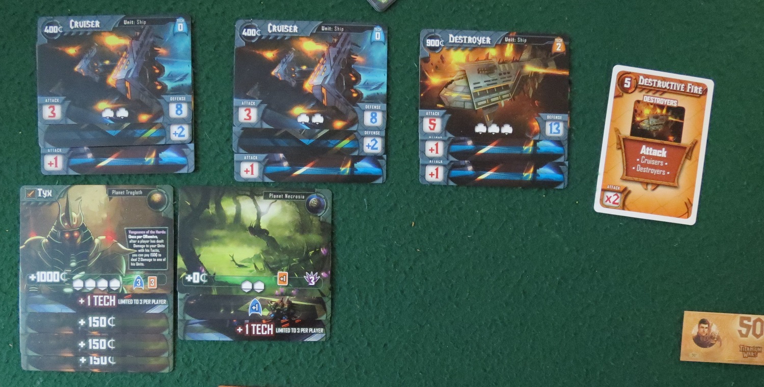This part of the game is all about negotiation, though it might not seem like it at first. In our first game, we drew an event that told us this planet was afflicted by “Radio Silence,” meaning negotiation wasn’t allowed in the conflict for that planet. “So what?” we said. After all, there aren’t any space-resources to dirty your hands with. You aren’t allowed to exchange credits or ships. Even alliances are short-lived because only one player can occupy each planet and there are no rewards for second place. We couldn’t figure out what on earth it wanted us to negotiate about.
