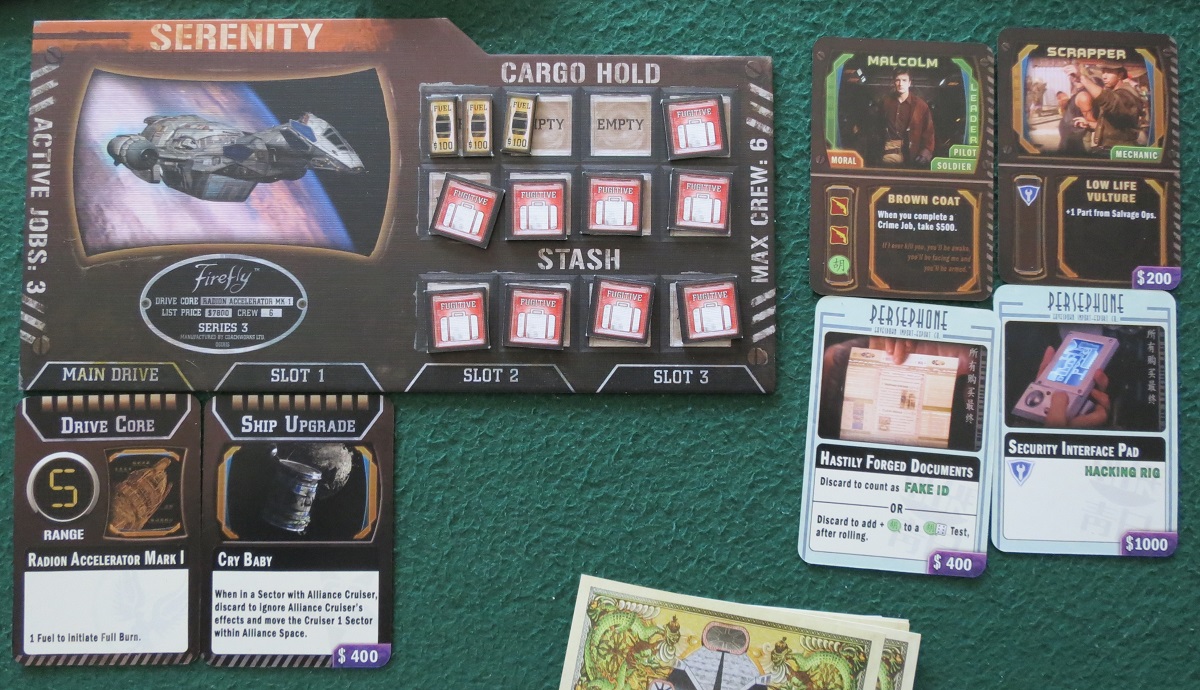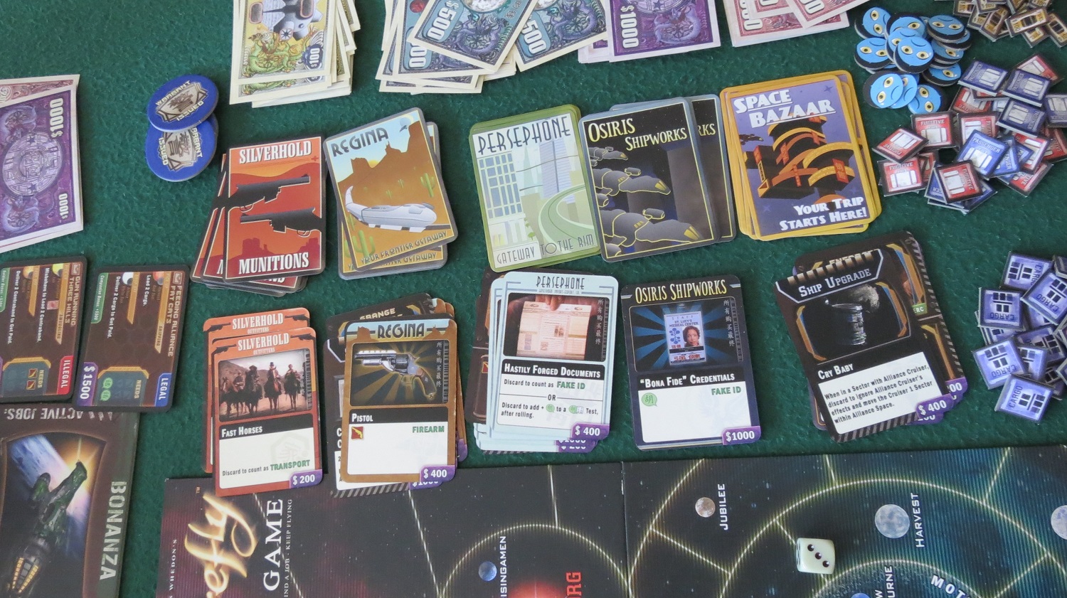 Since we didn’t have time for a full game — only two hours before someone had to head off, and (rightfully) suspicious of the advertized two-hour playtime — we just figured out the rules and played for money, flying around the Verse, dodging crew-murdering reavers and customs-enforcing alliance patrols, taking work where work could be found. It wasn’t a perfect experience, and we’ll talk about that later, but for a couple hours the room was painted rosy, every flipped card a fondly remembered scene or line of dialogue.