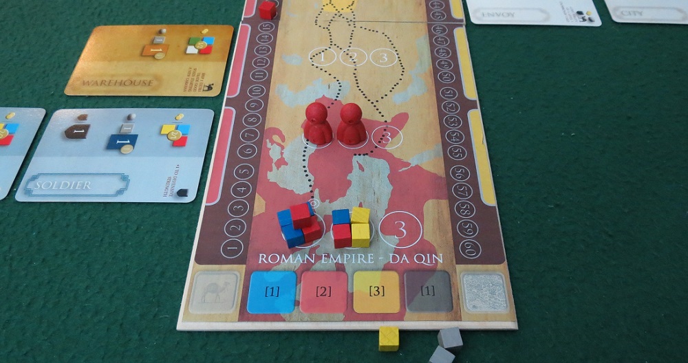 Best of all, it makes for a good competition. Even though it’s simple, there are always multiple ways of progressing along the victory track, meaning the path to success is more dynamic than you’d initially think. Should you tighten up your deck by building some cards to your tableau, or could you use that Guard and Settler later on? Should you risk a trio of caravans loaded with silk and porcelain, or do you have a hunch a bandit chieftain might show up to claim the riches for himself? As the Han Dynasty, should you use your tricksy court cards to steal some Roman technology, or are you better off playing nice and negotiating trade deals? On the other side of the coin, the one adorned with some Caesar’s fashionable curled locks, should you invest in military strength to patrol the Silk Road to take down bandits, or are there not enough of the buggers showing up to justify the expense?