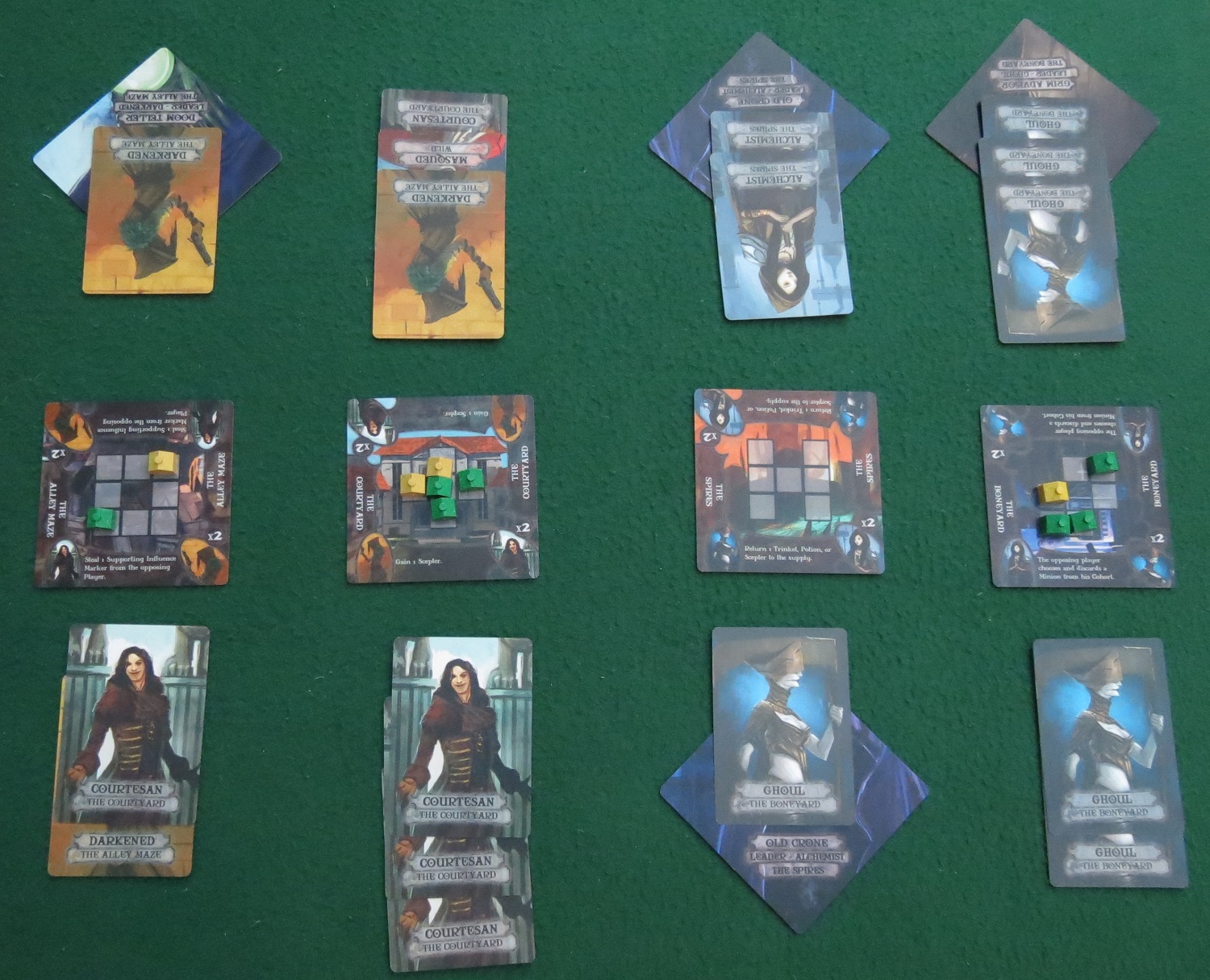 As I was saying, Vault of Darkness ranked about as high on my hype meter as last summer’s news that Walmart was selling Twinkies three days earlier than advertized. As in, barely at all. There were a lot of little ways the original Hemloch won me over, whether its many ways to earn victory points, sadistically cutthroat strategies, or diverse draw decks. Ah, those draw decks — they were like treasure chests of glimmering possibilities, each card a cold-blooded flick of the knife to your opponent’s jugular. And there were a ton of them, both decks of 30 cards packed with 13 unique minions, all possessing wild abilities that could swing even the most desperate game to your favor if you played them right. On the other hand, Vault of Darkness used nearly the exact same deck from Shadow of the Sun, so each of its minions was identical other than name and color, with no distinctive special ability to set them apart. Strike one, Vault of Darkness.