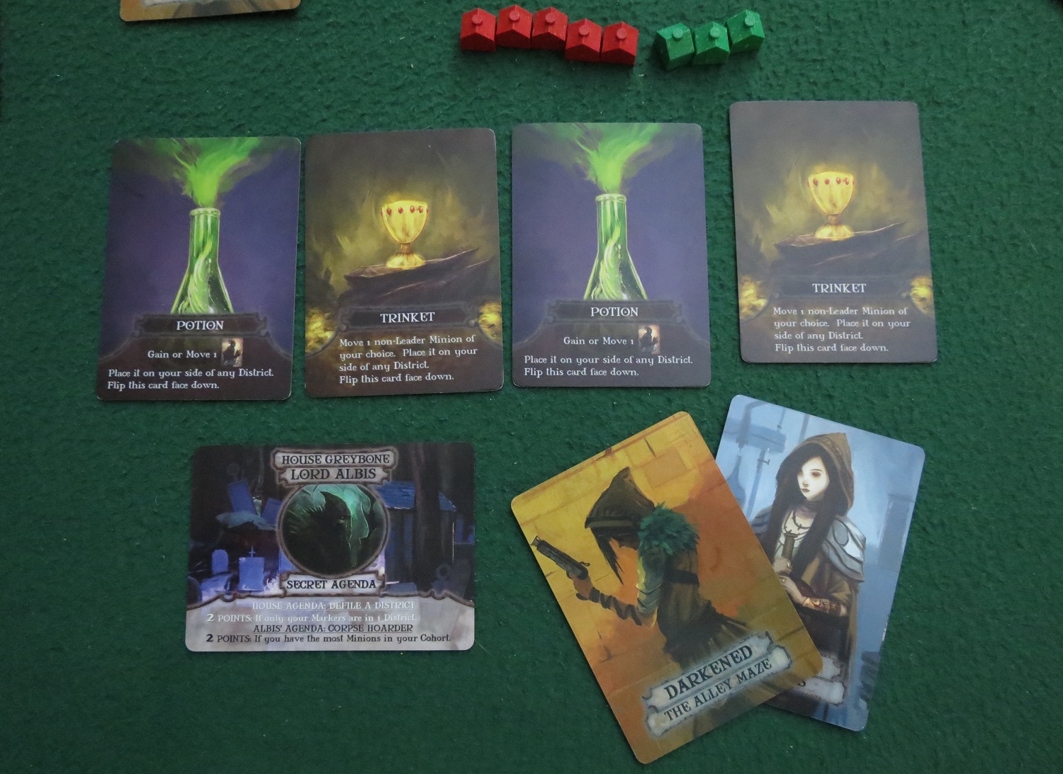 For instance, one of the special minions is called a Servitor. The rulebook establishes that Servitors are obtainable only through special actions, and that although they don’t add much influence, they always trigger the scheme of the district they’re deployed to. Unfortunately, roughly ninety-five percent of their appearances occur during the “Night’s End” phase, which takes place after all that relic stuff and sees both players taking a special action like adding a minion to their cohort, deploying an extra minion from their cohort, or using up one of their treasures. The problem is that during the Night’s End, no district schemes can be triggered. Which means Servitors are functionally worthless, and may as well not even be in the game.