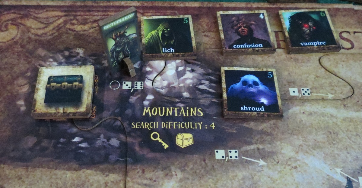 The second type is secrecy, which measures how aware the necromancer is of your activities. High secrecy often means kinder event cards; for instance, running across a “Shambling Horror” while hidden means you have to fight (or flee from) a regular old zombie, while an exposed hero would have to face a much deadlier opponent. Also, the necromancer occasionally detects and pursues heroes that don’t manage to escape his gaze, and since the necromancer’s presence usually means a whole bunch of extra blights, less secrecy for everyone at his location, and sometimes a really tough battle, you usually want to steer clear of the old bastard until you’re good and ready to end his reign of terror for good.