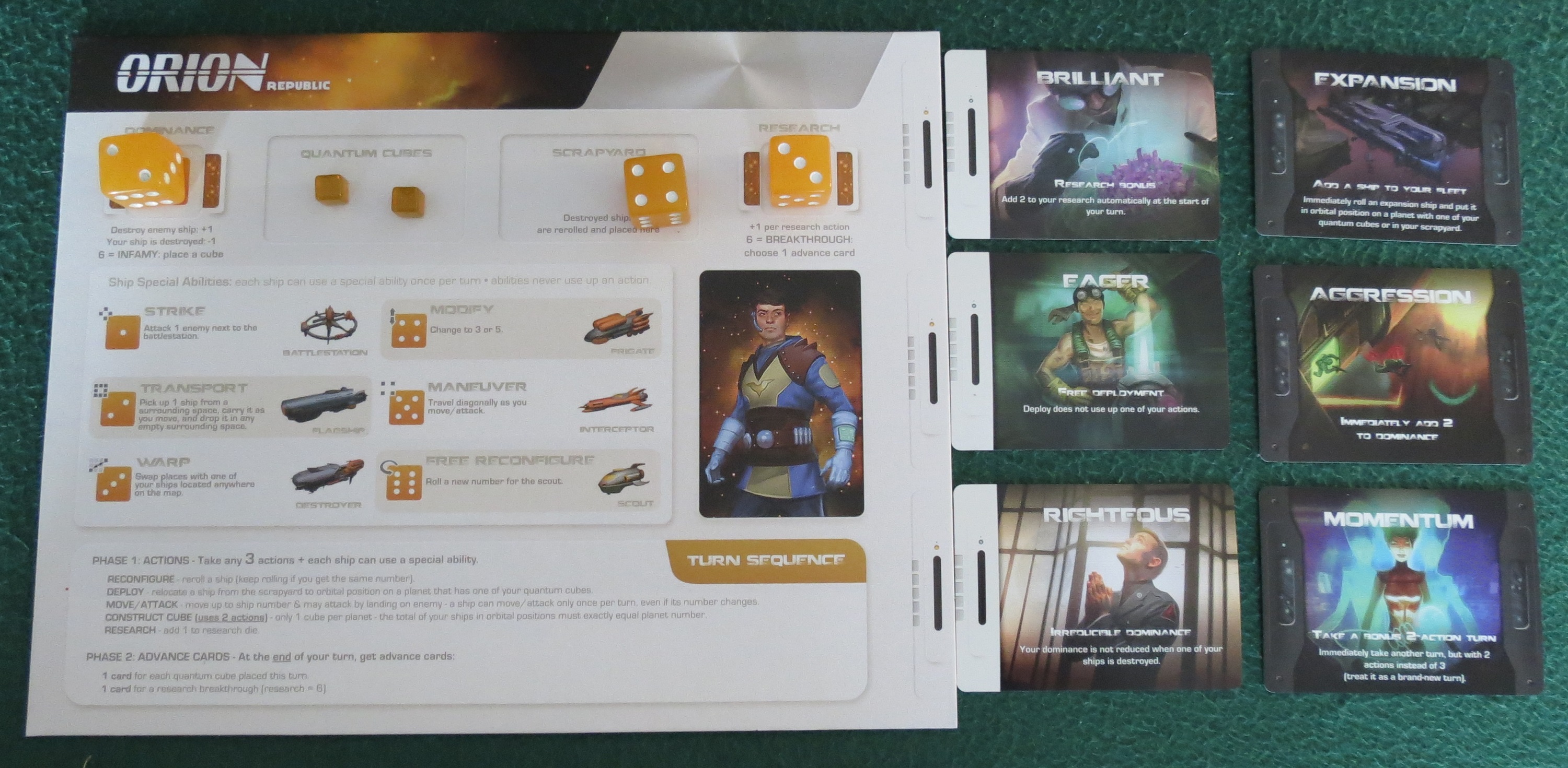 Okay, so forget about all that quantum stuff, because as much as the game would love to explain it — even to the point of including a timeline that opens with the discovery of quantum dice in 1952 (not a joke) — it’s really just an excuse for the game’s highly stylized and dice-centric setup. It comes with the same sort of modular space-map you’ve seen a dozen times before, only this time, in place of little starships of different shapes and sizes, it’s got a whole bunch of brightly-colored (and slightly translucent, giving them a vaguely outer space-y glow) six-sided dice. And these dice are more than just a way to save on production costs, because whichever number is showing is the combat value and travel speed of that ship — so a 1 is a trundling but powerful battlestation (the low number wins combat), while a 6 is a scout nimble enough to travel across nearly the entire galaxy in one go, but so weak-sauce that you can’t expect it to do much of anything once it arrives.