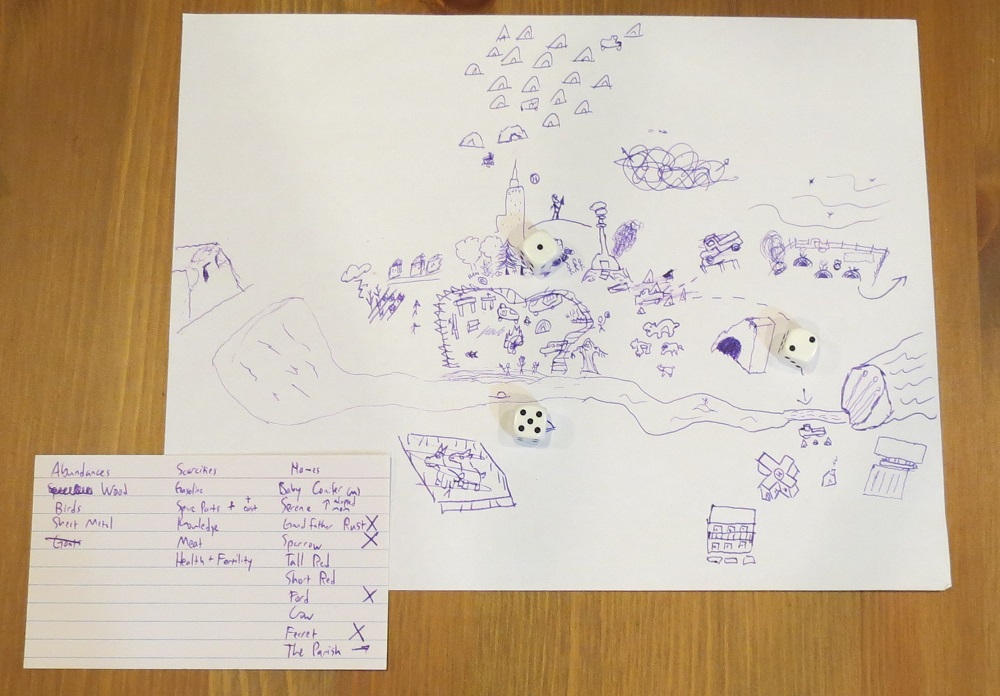 Okay, I’ll give it a shot. It’s a map-drawing game, where you and a handful of fellow players create your own tribal landscape. Or post-apocalyptic bunker complex. Or lost-in-Disneyland dream-scenario.