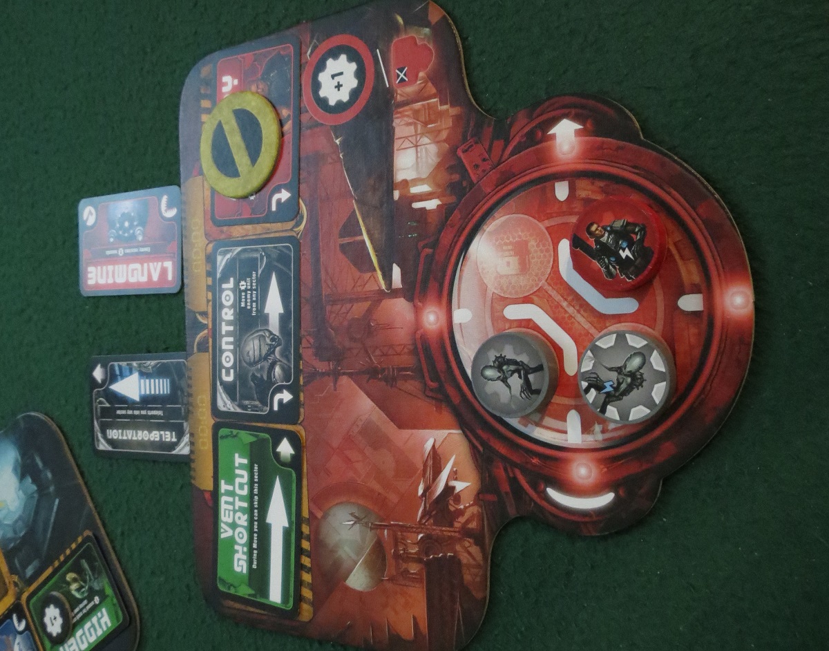 One of your primary concerns is figuring out where to place your faction cards. Each sector has a number of slots for installed cards, cool stuff like traps and ambushes and camcorders (we’ll talk about these in more depth in a minute), but before you can install any, you first have to set them up in a sector’s pending slot. Only once you land on that space a second time can you actually move your pending card into a position where it will hang around and provide its benefits or dangers or whatnot; and in the meantime, enemy pawns are free to stop on that sector and replace your pending card with one of their own, royally screwing up your plans.