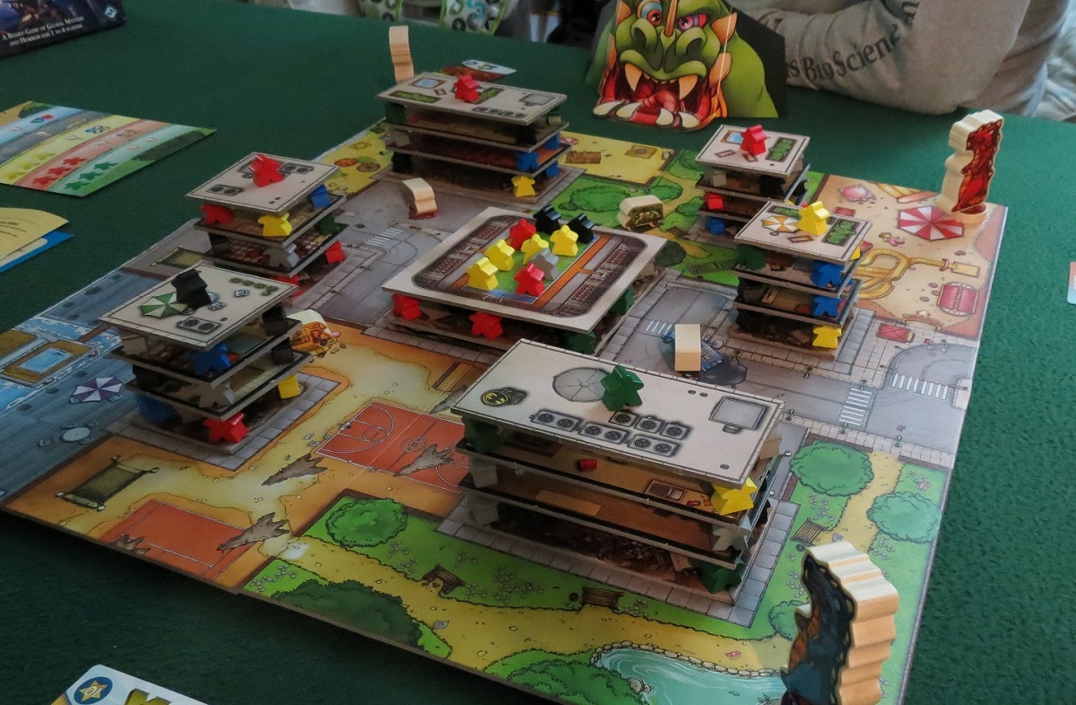 Alternatively, you could rest your chin on the monster’s head and try to blow the building down. This is a tactic you’ll probably try once before swearing off your sedentary lifestyle as you wheeze and gasp and push a single meeple off the board.