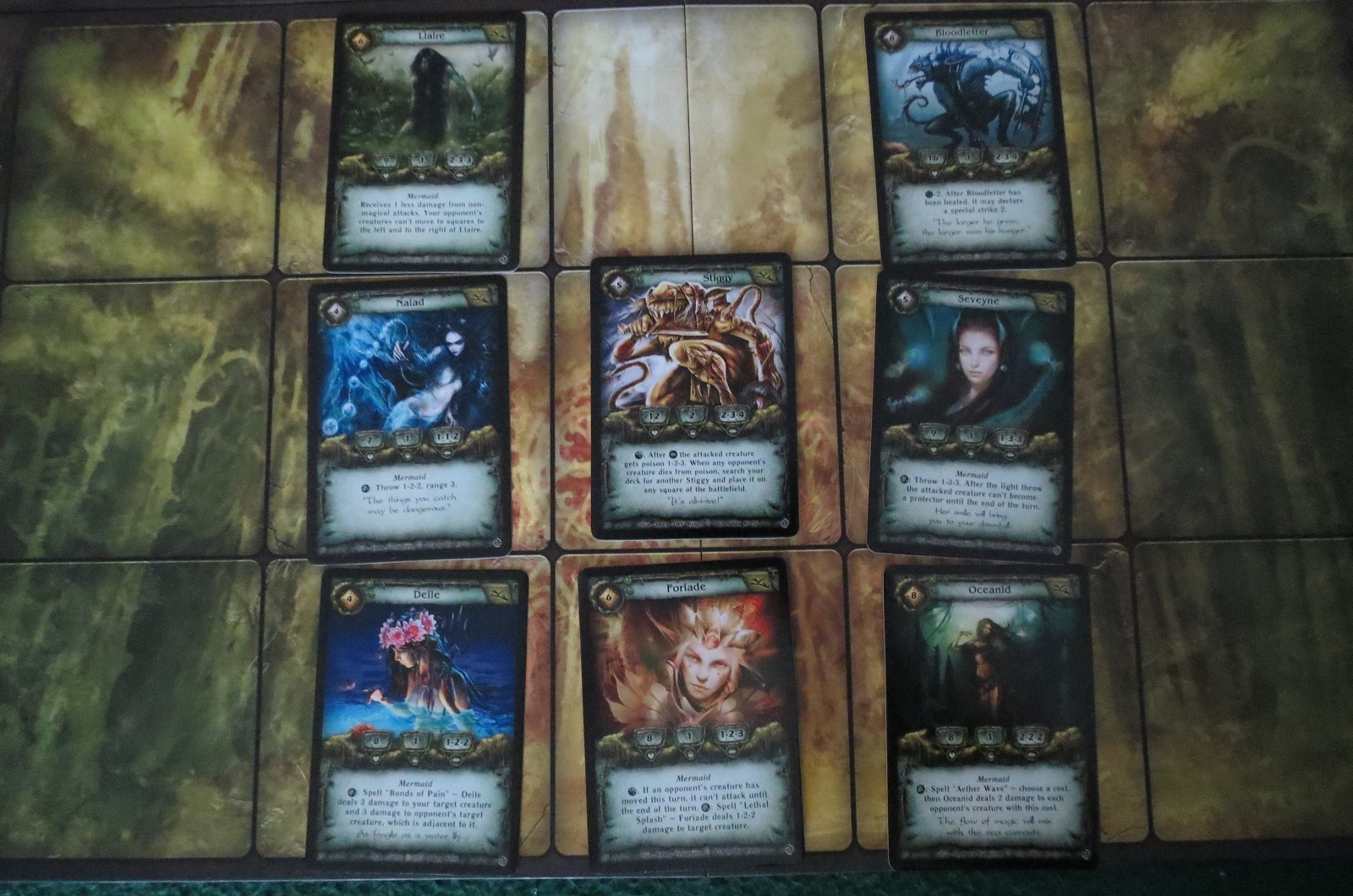 2. Excellent and balanced review, probably the first I’ve seen for this game. This reflects quite a bit of my experience with B:WotR as well. Considering its popularity, I was hoping for Magic: The Gathering: Russian Edition, with a bit more complexity and a board to move the units around on. Instead, when I first got my Kickstarter stuff, I was appalled at the complete lack of anything resembling balance. The Dark Realm (the undead) are absolutely unbeatable, at least until you play the Swamp (mermaids) and use some of their most abusive cards. Similarly, the Forest (elves) has very little chance against Fire (the dragons), just because everybody has that Scale ability. The others seem to have better balance, but still, to have three ubercharged teams out of a roster of six (seven if you count the neutral deck, which isn’t actually made for balanced play) just isn’t right.