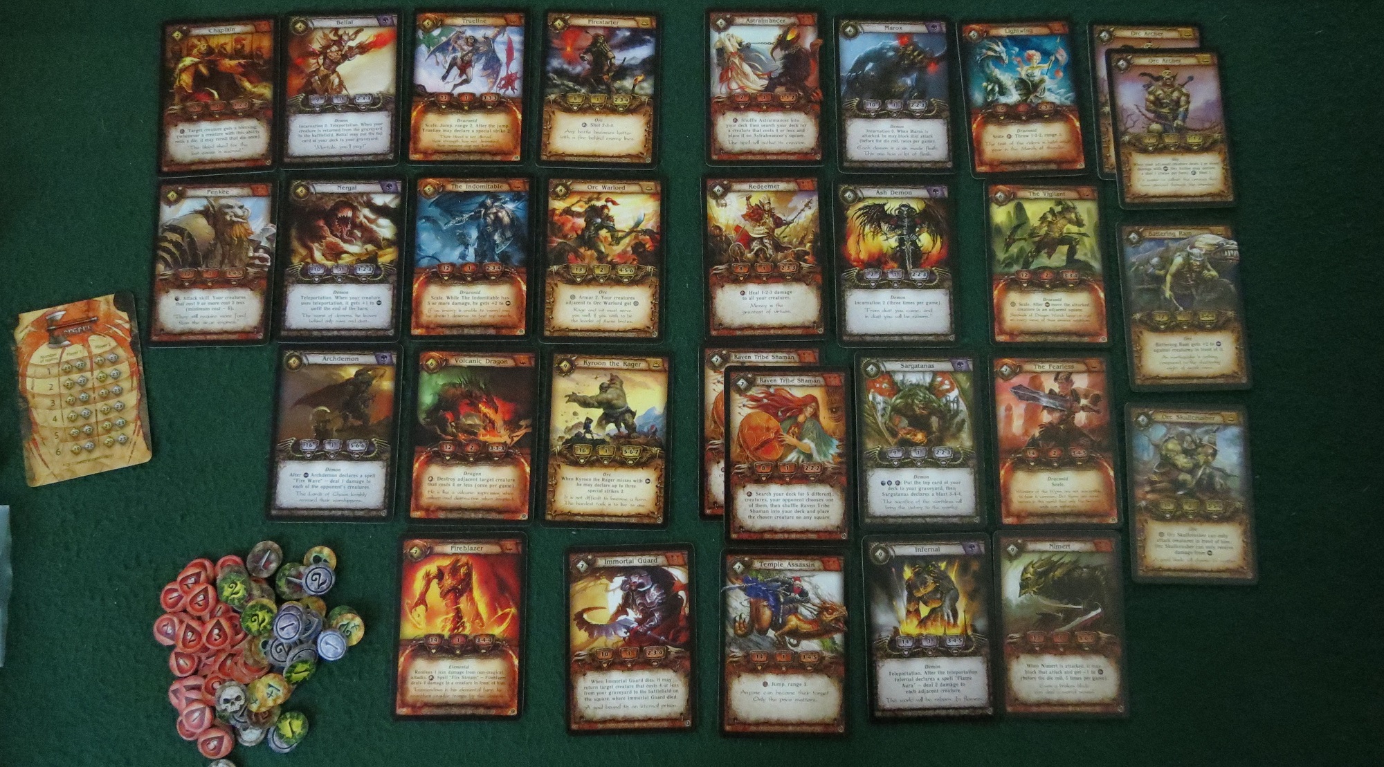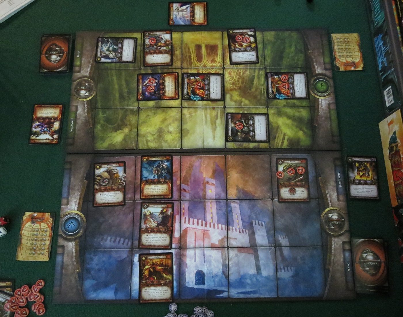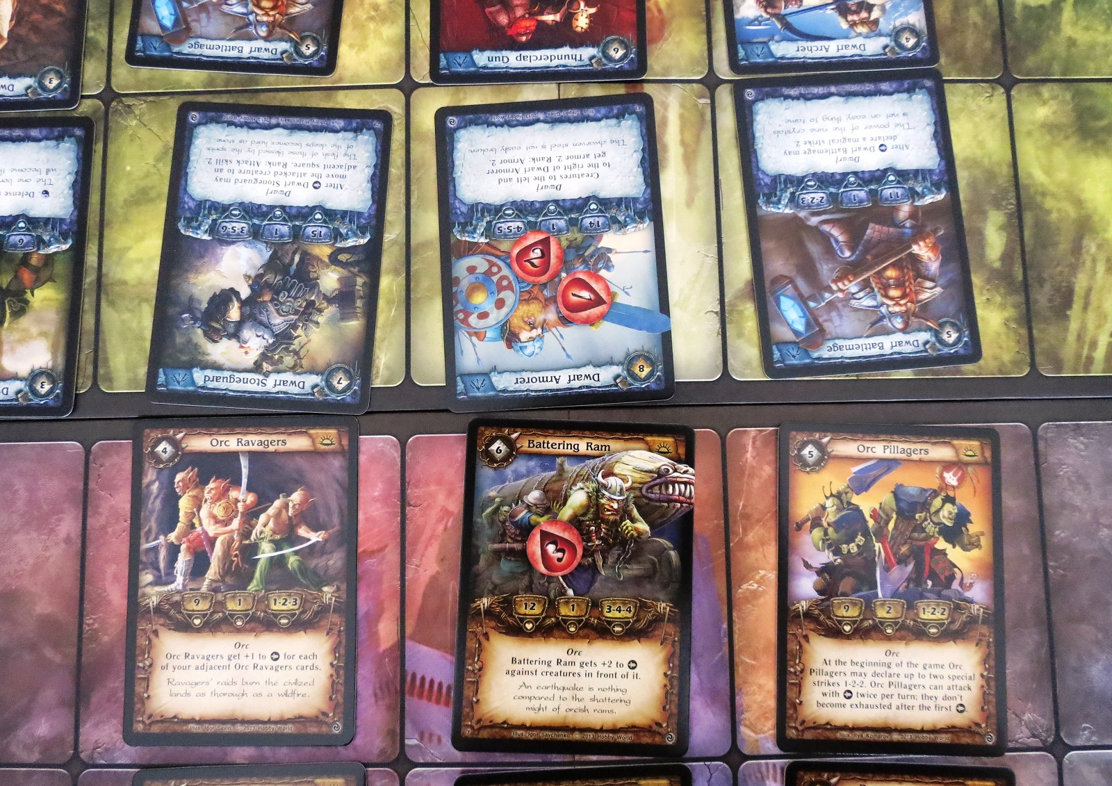 So we mixed everything together (sans the multi-realm cards, we aren’t quite ready for that), dealt out a few piles of cards, and began assembling two new decks from scratch. We each got a few broken-awesome cards, passed on the stinkers until we were eventually forced to incorporate them into our designs, and ended up with respectable multi-realm armies that were both more balanced and more interesting than anything we’d played before. The match that followed was tense, close, and bloody. Positioning mattered, as did decisions about when to activate our respective special abilities.