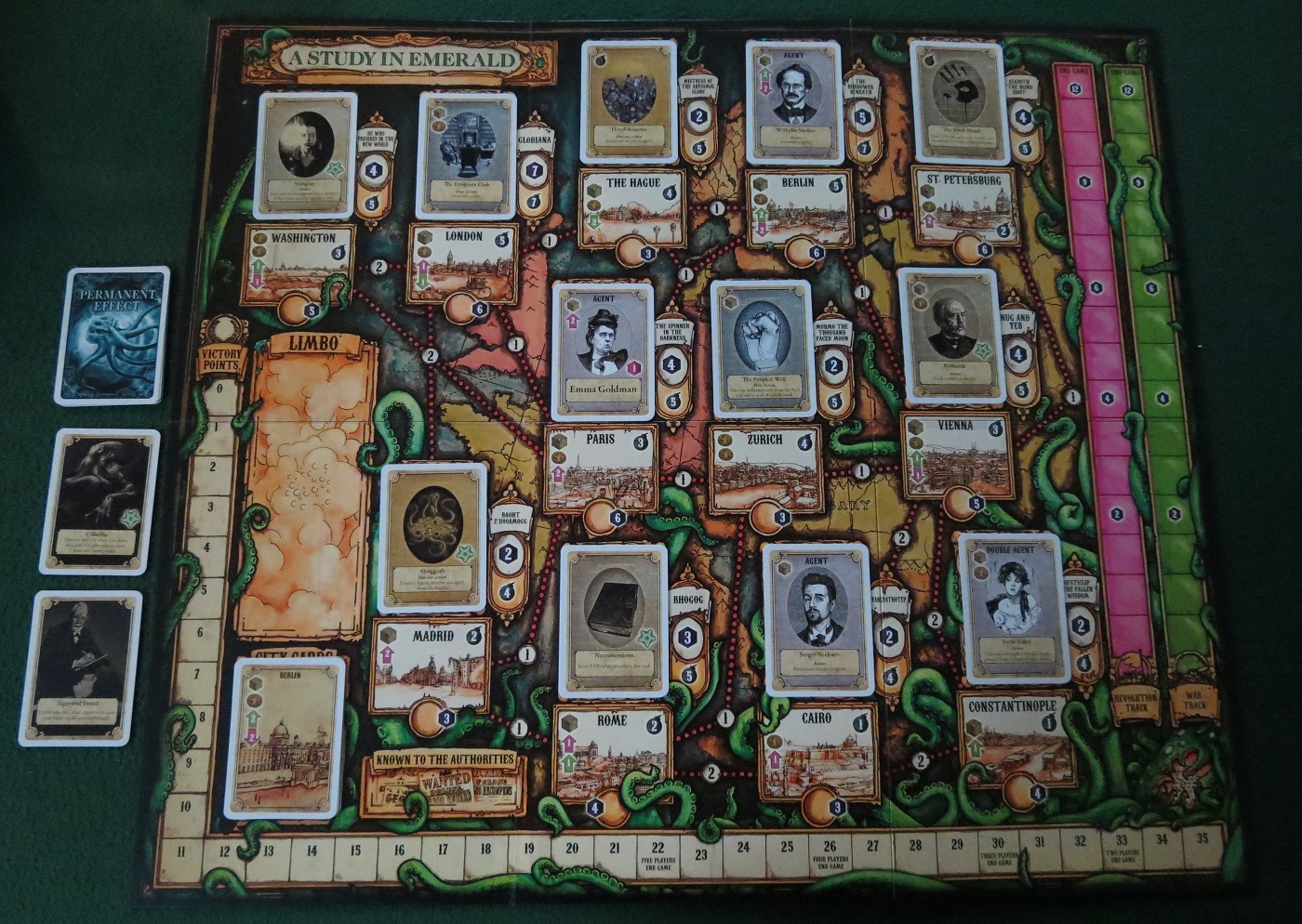 This is the bleak world of A Study in Emerald by Martin Wallace, an inverted — or rather, a perverted — take on the era of Sherlock Holmes, full of all the real-world romance of anarchism, but without all the unnecessary guilt over exploding royalty. Since they’re, y’know, aliens.