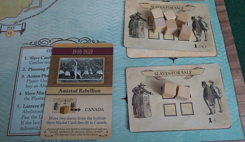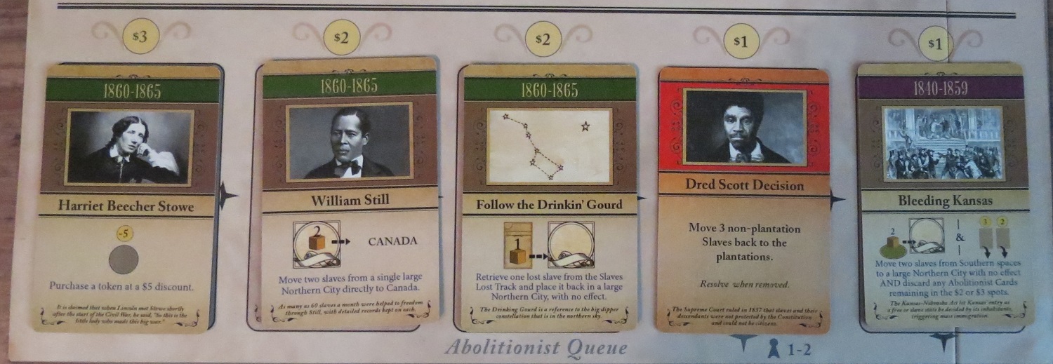 Here’s the situation: I’m playing the solo game, and it’s my goal to get five families to freedom. We’re coming down to the wire — I’ve nearly lost my limit of twelve groups of slaves, there are only two rounds left, and although I’ve successfully garnered enough support to win, I’ve got a couple opposition cards breathing down my neck. Namely, Vice President John C. Calhoun is strangling my funding and the Gag Rules are severely limiting my options by only letting me purchase one action token instead of the usual two each round.
