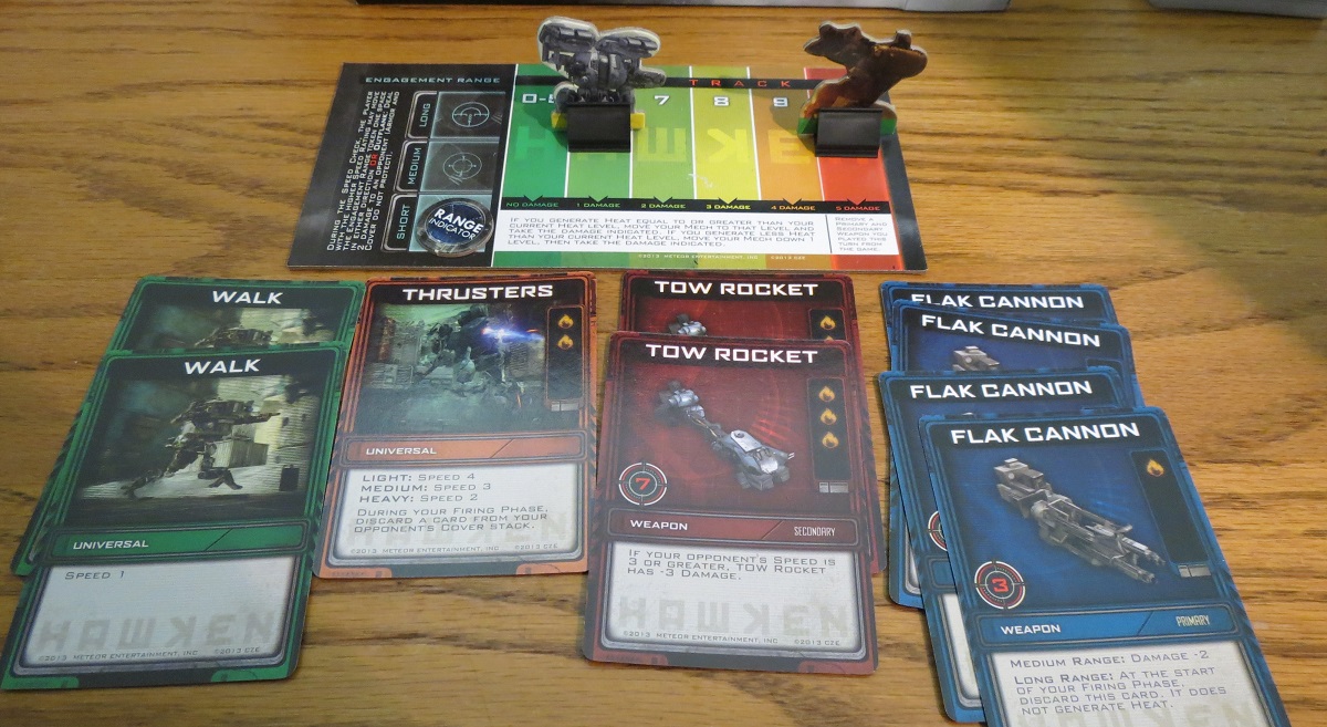 With your deck held in one hand and heart aflutter, someone shouts “Ready set go!” and you’re off, peeling a single card from the top of your deck and slapping it down into your mech’s playing area, racing to add more of those movement, weapons, armor, and abilities cards to your array than your opponent. Now and then, you’ll draw a useless card — say, maybe another “Thrusters” card when you’re playing as a heavy mech whose attempts at using jet-packs are about as graceful as an obese penguin launching itself over a cliff, or an “Armor” card when you’re a light mech hoping for more thrusters — and you can play that worthless card facedown as “cover” to block incoming fire. After you have a few cards down (and hopefully a superior set to the one your opponent has assembled), you’ll jerk across the table and draw the “FIRE!” token, signaling that your mech has unleashed hell.