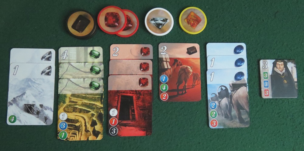 Then a couple more rounds pass, and everyone’s picking up a few gems at a time until the piles are running low, and you realize you can buy something. Probably a crappy emerald mine in India. It won’t give you any victory points, but it will give you a discount on future purchases. One less green — pardon me, emerald — off anything you buy in the future. You’ve just acquired a juicy long-term investment. So why not acquire some more?