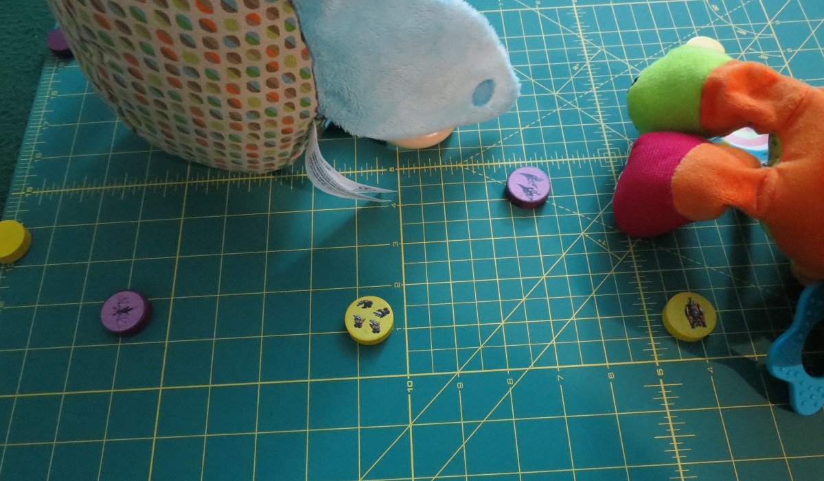 • For the mat I used a fabric cutting board that we often levy from the sewing room for dexterity games. If you have a regular wood table it probably wouldn’t be necessary to have a mat, but on our felt game table there was far too much friction unless you really pelted the discs, at which point there isn’t much fine control.