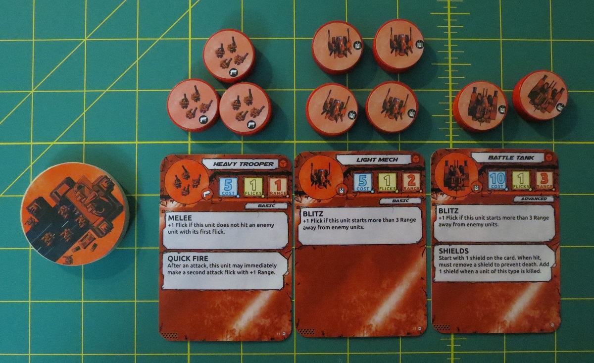 What sets Flick Wars apart is that you can’t just blast stuff across the table with immaculately-measured long-range shots. Sure, the ability to set up a position at range will come in handy, but unlike Catacombs or Ascending Empires or Rampage, your warrior/spaceship/kaiju can’t just charge across the dungeon/void/city and land a kill. Rather, this is the sort of dexterity game that rewards careful shots more than giving your soldiers whiplash with each and every move. Why? Because hitting an enemy disc without first getting your own disc in range doesn’t actually hurt them. And since a unit’s “range” is usually an inch or two, it’s best to gently slide them up next to your enemy and then declare the attack that will blast their brains out. And if your careful setup shot didn’t get you close enough, run away or flick your guy behind an obstacle so the enemy can’t take advantage of your proximity on their next turn.