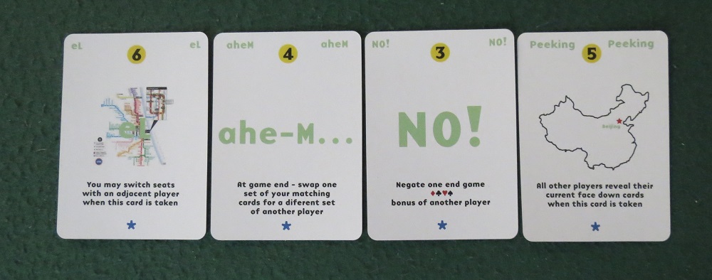 The cards in the middle reveal some of the game’s best ideas, especially since you’ll have to pick the right cards in order to gain access to them, which in turn requires the aforementioned decoding skills, or at the very least the ability to construct the right combo before someone else claims or blocks it. There’s the Peeking card, which abruptly flips everyone’s tableau face-up, cluing you into everyone’s strategy and potentially blocking certain cards they’d been saving to reveal; or the eL card that lets you swap seats with the player you suspect has been building a superior tableau.