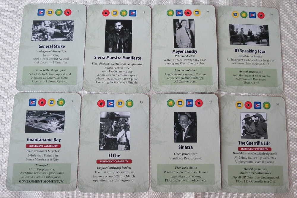 Since each entry of the COIN Series is roughly similar, by learning one you can play them all, albeit with a few rules changes. In addition to the fresh scenery between Andean Abyss and Cuba Libre, Cuba Libre is the streamlined younger brother. He might not be as smart or as complicated as his older sibling, but he sure is easier to get along with. For instance, gone are the lines of communication — the highways and pipelines that are so crucial to Colombia and therefore Andean Abyss — and in their place, there are the smaller and more easily tracked economic centers, representing Cuba’s wealth of sugar, mining, and cigars. The former game’s sprawl, the neighboring countries and the uninhabited expanse of the Amazon, are all gone. All in all, there’s less to keep track of and the map is less than half as big; where Andean Abyss has eleven cities to manage or terrorize, Cuba Libre only has three.