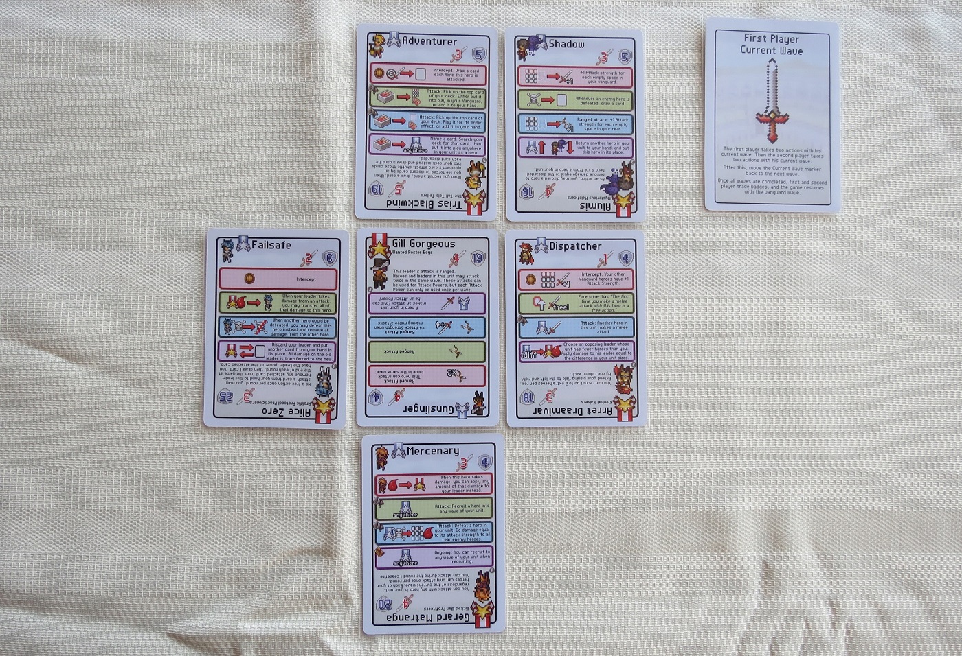 But here’s the thing: I really don’t care. I love Pixel Tactics, and although I wasn’t expecting to be so thrilled with these new heroes and leaders, I ended up falling under the game’s spell yet again. I love their new combos, especially the way they seem to synergize even more readily than past Pixel Tactics heroes did, with lots of heroes supporting their fellows, or blocking damage, or sacrificing themselves to prevent another hero from dying, or calling in help, or boosting everyone’s life points, or creating better chained attacks on the enemy leader right after you killed off his protector. Within two minutes of breaking out the new decks, we were knee-deep in yet another excellent Pixel Tactics battle, with all the nail-biting calculation, positioning, timing, and cautious symbiosis of heroes, leaders, and special abilities.