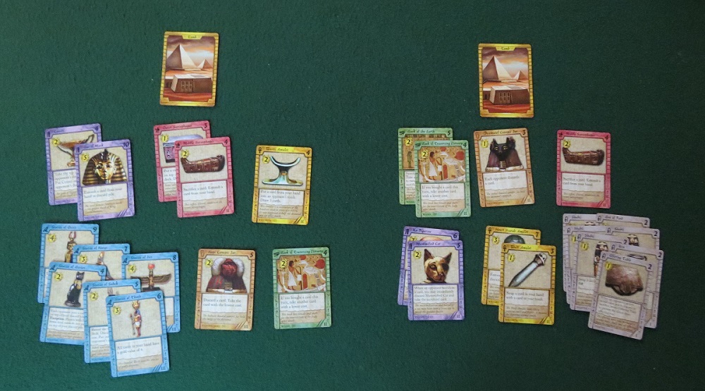 Perhaps my favorite thing about Valley of the Kings, aside from all the stuff I’ve already mentioned, is the way it allows for a wide array of strategies. In addition to figuring out a way to maximize your money, actions, and entombings each turn, you can do irritating stuff like drown your opposition in useless Shabtis courtesy of an Outer Sarcophagus, or, once your opponents have no more Shabtis to give away, play something like the Statue of Bastet to force them to place decent cards onto your discard pile, or take advantage of their inattention with the Censer to steal from the top of their discard pile.