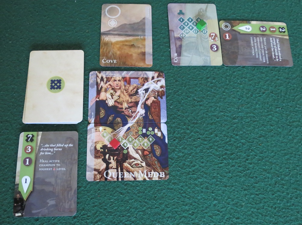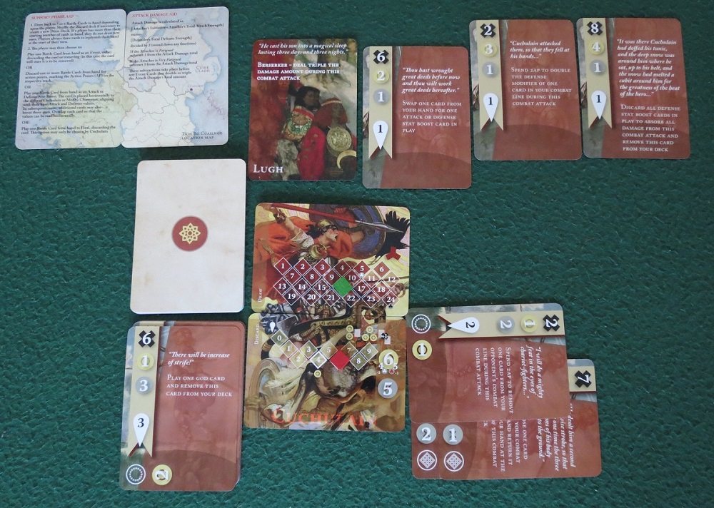 As is often the case in games from Todd Sanders, one of the most immediately pleasing aspects of The Táin is the clarity of The Táin’s graphic language, which moves you from learning the game to playing it with a minimum of fuss. The game’s central decision space arises from the fact that each card can be played in a whole bunch of ways — as a special event, say to switch the location you’re fighting at this round or play one of Cuchulain’s limited god cards, or as a temporary or permanent stat boost to attack or defense, or to gain action points, or as healing power — and figuring out each card’s particular strengths is a simple task thanks to Todd’s usual crisp design. Even the reference cards are gorgeous, depicting a map of the region, in case you needed that extra context before Cuchulain’s struggle (read: turning down sex) with the goddess Morrigan really clicked.