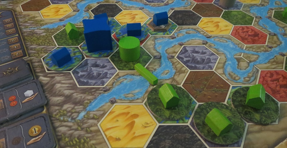 The thing is, this way of looking at Terra Mystica isn’t quite as successful as it might sound, because no matter who you play as, your method of interacting with other players is always roughly the same — by terraforming and occupying a hex before someone else does. The Giants might be able to terraform all land types for the same cost, but their only way of irritating other players is exactly the same as how the Mermaids go about doing it, though the Mermaids will use lakes instead of wastelands. If someone is getting ahead, you build in such a way that it blocks them, and that’s about it.