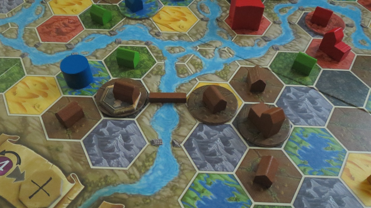 You can use some of your magic to build bridges to cross the water and create towns, clumps of settlements that bring extra victory points and other goodies. You can manage your magic pools so as to give yourself an epic turn that leaves everyone at the table jealous. Or balance your structures until you have enough workers, gold, magic, and priests pouring in each turn.