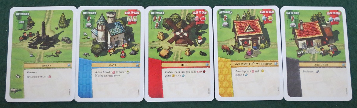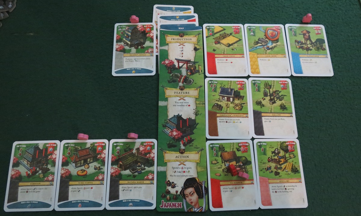 Each of these options requires resources, usually food for deals, swords for conquest, and a combination of wood and stone to build. Thus, each round settles into a rhythm of drafting some cards, picking up resources, and then building to your heart’s content, giving your opponent’s tiny empires the evil eye and trying to finagle a way to pick up more points before the game’s five rounds come to a close.