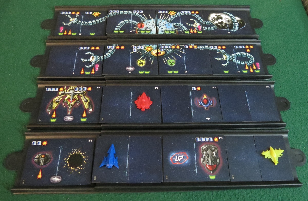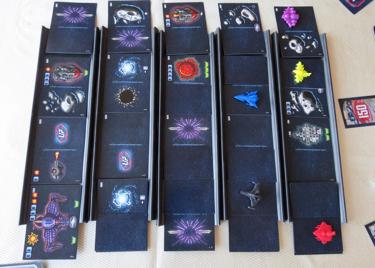 It’s a clever system, and my group had a ton of fun messing around with each other, racing to destroy the toughest enemies or capture the most glorious space-mazes or singularities, and blocking each other’s flight paths. In fact, I’ve only got three complaints. First, you’ve got to turn on some sort of theme music to get in the proper mood. Once I put the Guile theme on repeat on my phone, the game clicked and our enjoyment tripled. Second, even though the game comes with multiple “zones” to fly through, from the easy “asteroids” and “squadrons” zones to the ultra-tough “fleet” and “tunnels” decks, as well as four bosses and a whole bunch of power-ups, missions, achievements, etc., it still feels like it’s begging for more expansions to add even more zaniness.