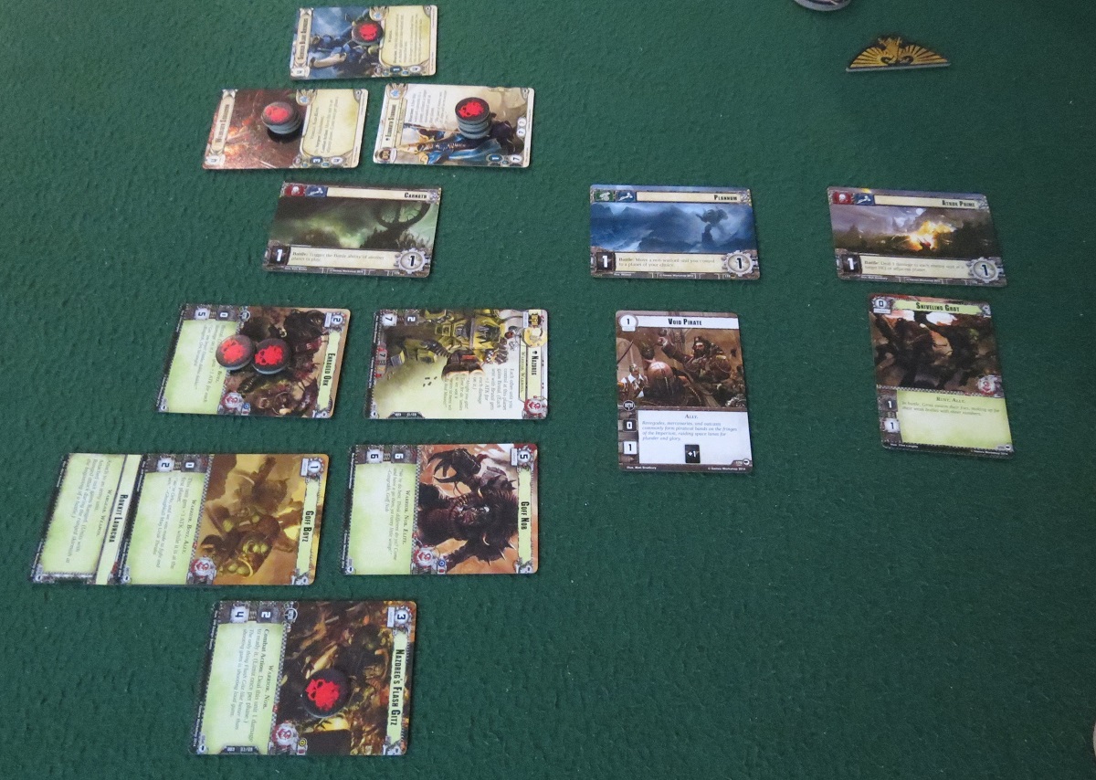 Probably the thing I like most about Conquest is the way it handles warlords. Each faction comes with one of these guys, an extra meaty leader-type with a powerful ability — for example, Captain Sicarius of the Space Marines gets an extra resource whenever an enemy unit dies at a battle he’s present at, while Packmaster Kith of the Dark Eldar puts a free Khymera into play when she arrives at a planet. These warlords begin the game in play, and every turn you set this little dial to indicate which planet yours will deploy to, bringing any spare units along for the ride.