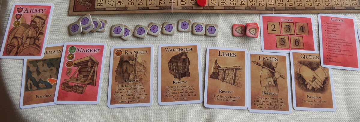The card play can be a tad involved, but the result is generally solid. Consider this: There’s a victory card that gives points to whomever takes over one Mythotopia’s two islands, so you’ve carefully positioned yourself along the sea at the province of Camarine, hoping to make a beachhead on the westernmost island at the unfortunately-named Ictus, where all the locals can’t help but speak in stressed syllables. Unfortunately, one of your rivals is racing you to conquer that island. In order to invade, you need to assemble a near-perfect hand, consisting of (1) the Camarine card, because that’s where your troops will be departing from, (2) a card with a food icon to feed your moving armies, (3) a ship card, since you’re sailing across a water space, and (4) as many army icons on other cards as you can manage.