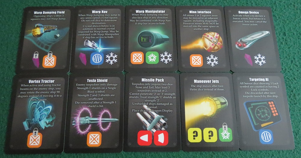 Basically, experimental equipment gives each ship a couple new spots to place dice and crystals in order to enable special new actions. For example, if you start the game with “Blink,” you can place a helm die and up to three tractor dice on it to zip off in a direction that your ship isn’t necessarily facing, while the NeuroNav Interface gives you a new way to use crystals by letting you place them on the card to ignore nebulae and asteroid fields.