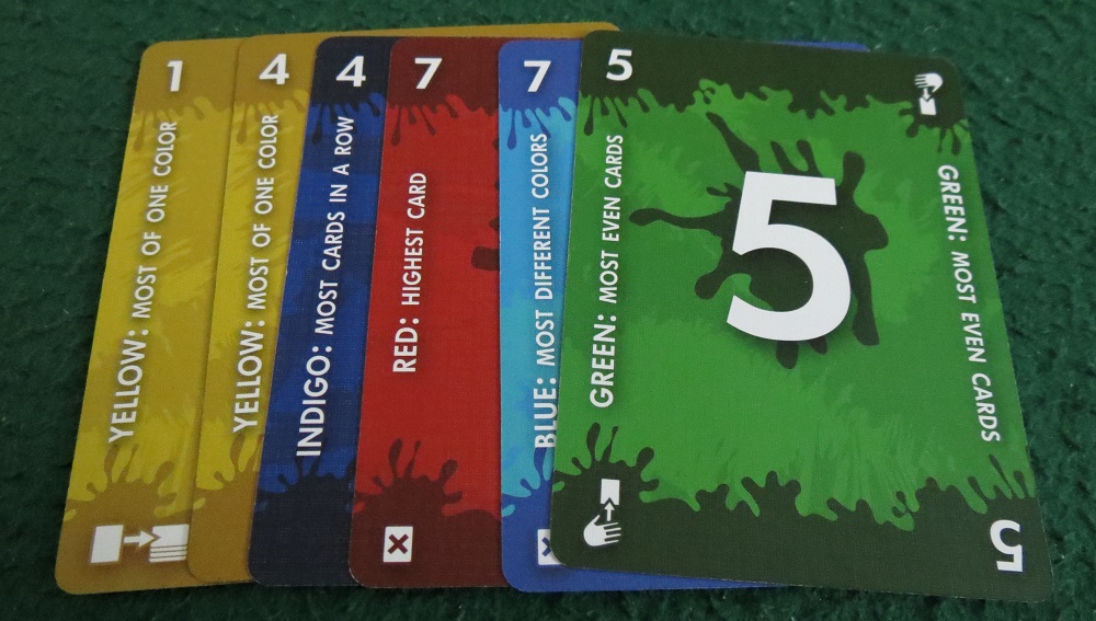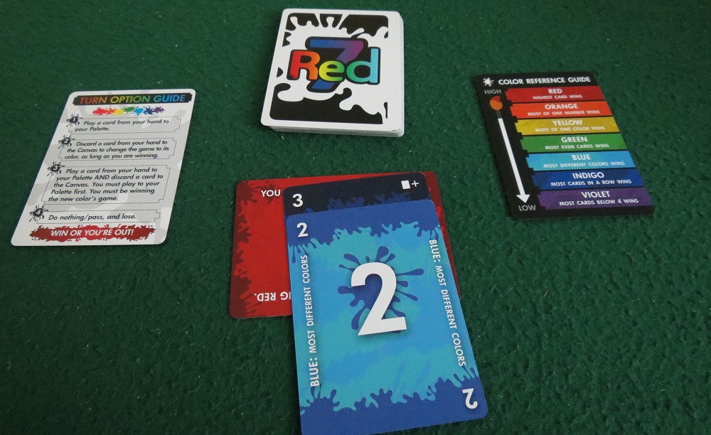 Only it isn’t often very simple. You might, for instance, play an orange card into the canvas because you have the most cards of one number, or play a blue card because you have more different colors than anyone else, but you need to constantly monitor everyone else’s palettes, first of all to make sure you’re winning at all and second to determine if they’re working up to a particularly difficult-to-beat combo once everyone’s hand has run out. Ties are broken by high numbers and then color, starting at red and running down the spectrum to lowly violet, so the prized Red 7 is often a game-winner unless the other players can fill the canvas with victory criteria it can’t beat.
